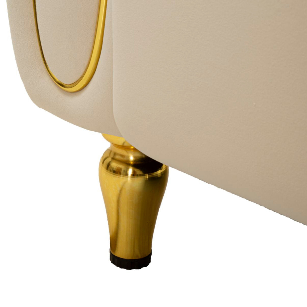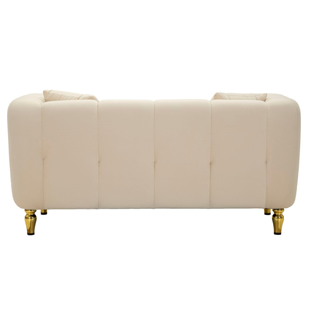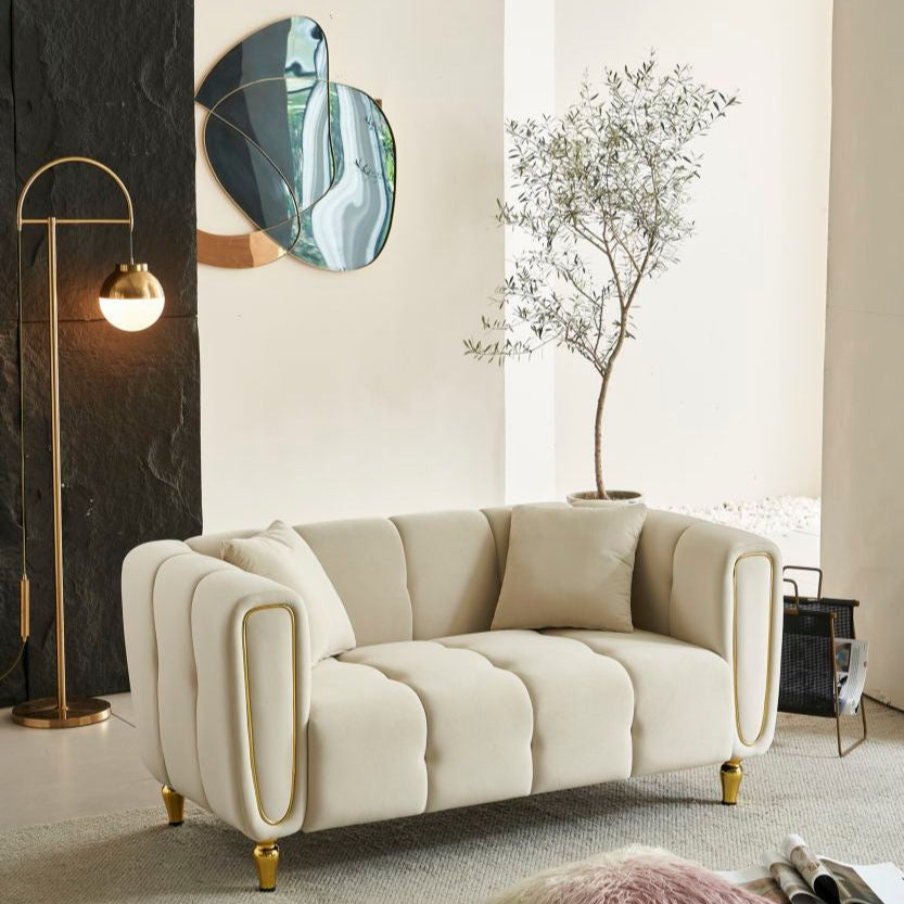 Alma is a 2-seater sofa designed in a classy style, with a comfortable and deep seating surface. Its beige or light brown velvet, tufted upholstery offers a clean and aesthetic look, making it a perfect fit for any space. Its gold-colored metal legs perfectly complement its sophisticated silhouette. Combine with the Alma collection armchair for perfect comfort.