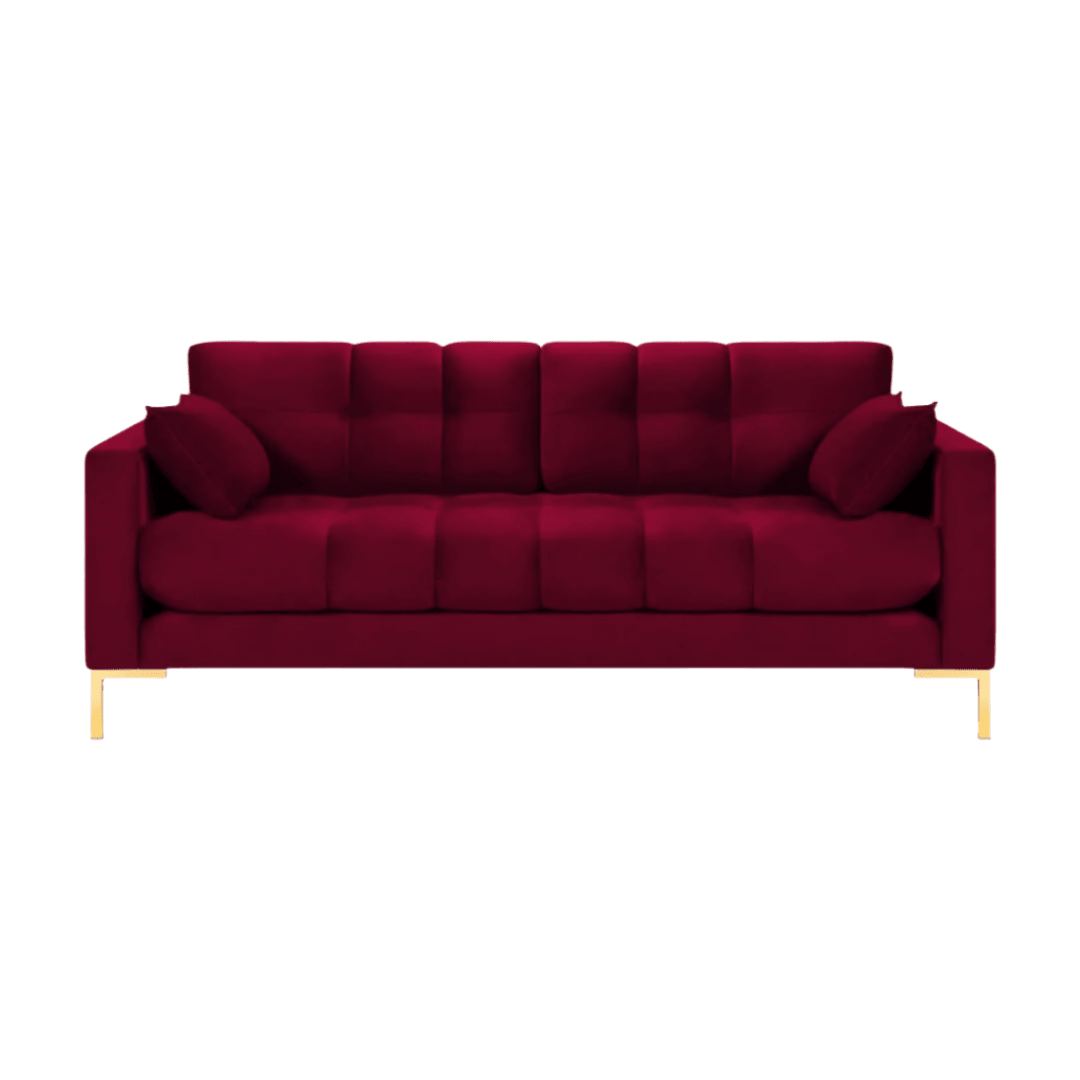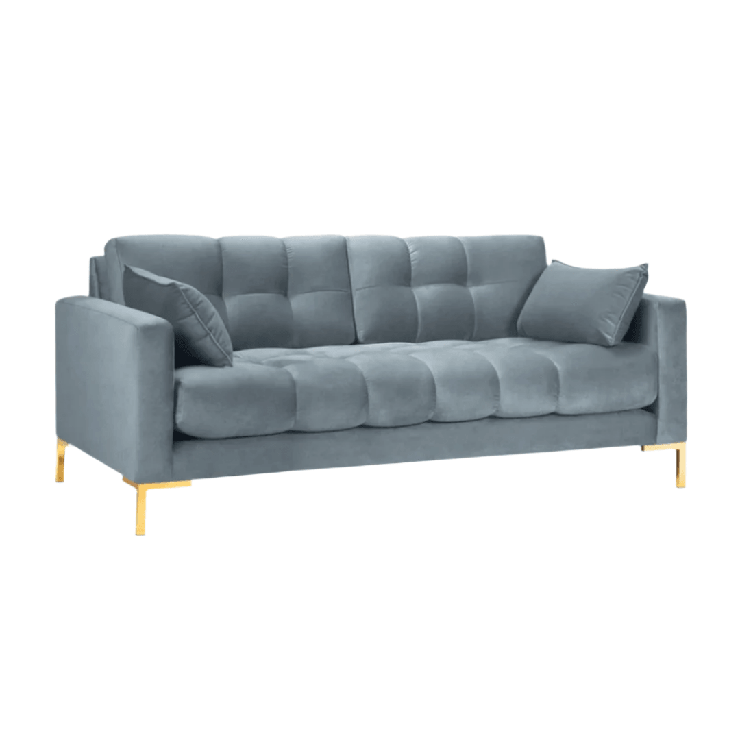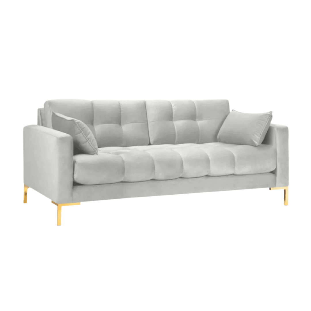 With its carefully quilted backrest and seat, the Mamaia 2-seater sofa will fill any interior with a unique, distinctive and positive energy. The side cushions with decorative trim provide even greater comfort and create a very stylish effect. The luxurious upholstery made of soft, velvet fabric and the geometric gold legs are a combination of modernity and elegance. The Mamaia models are extremely durable and solid, and they even look great when combined with other pieces in the collection.