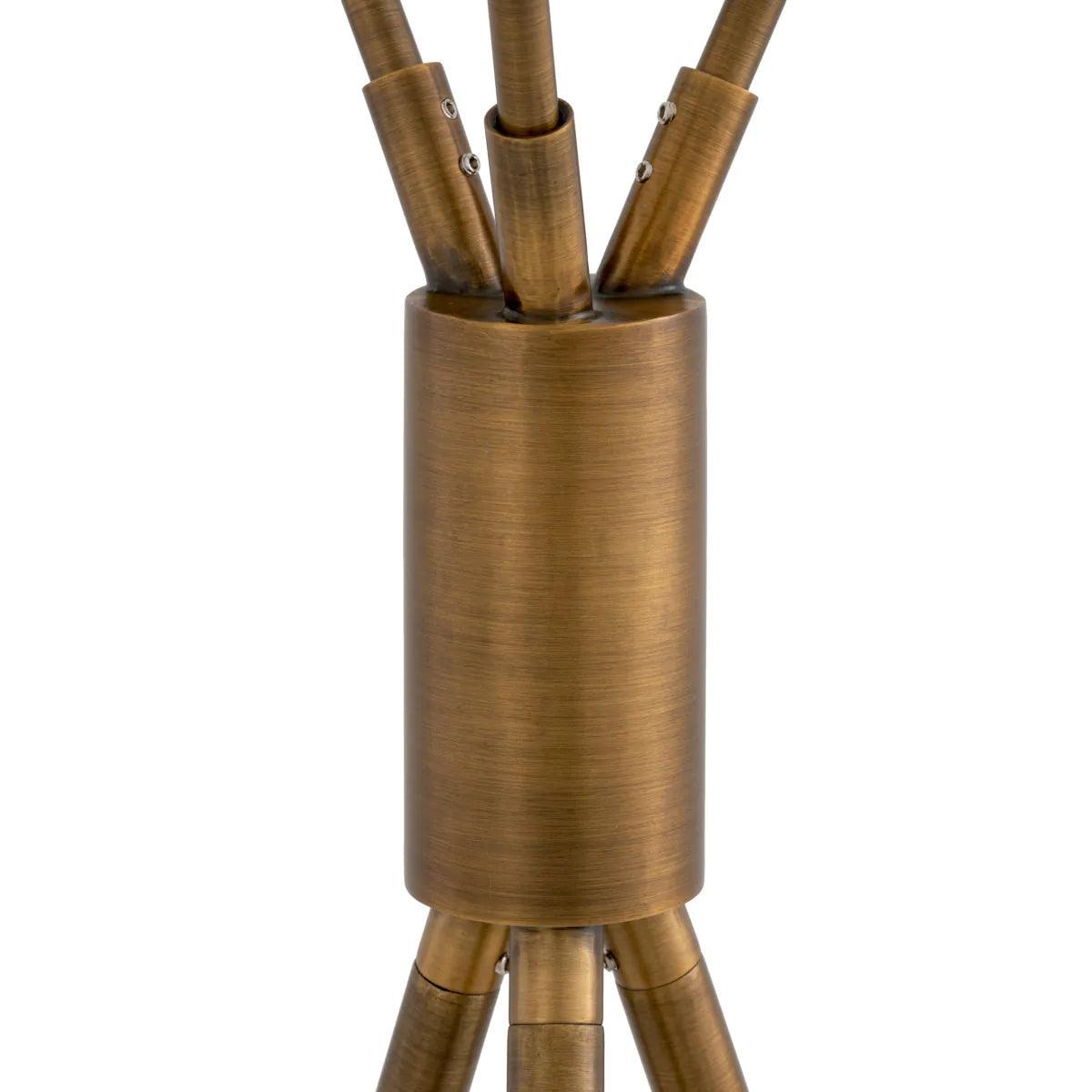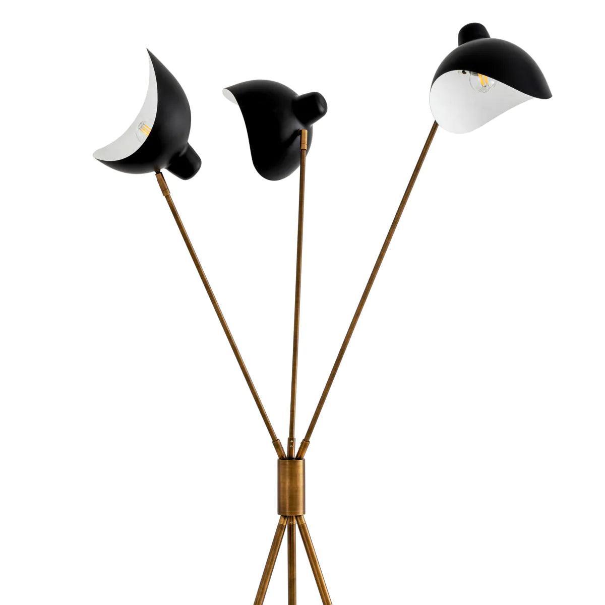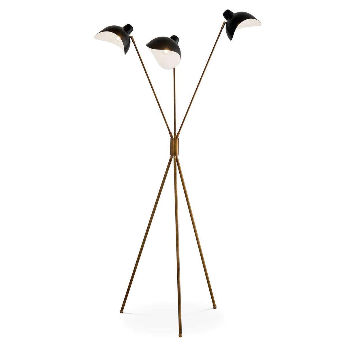 Capturing the aesthetic of designer lamps from the 1950s and 60s, the Costner floor lamp has been given an updated, sophisticated look, with a modern silhouette inspired by mid-century modern style. Its three elongated, antique brass-plated legs are connected in the middle, then open up again at the top to support the black lampshades. The shades can be rotated in any direction for maximum flexibility.