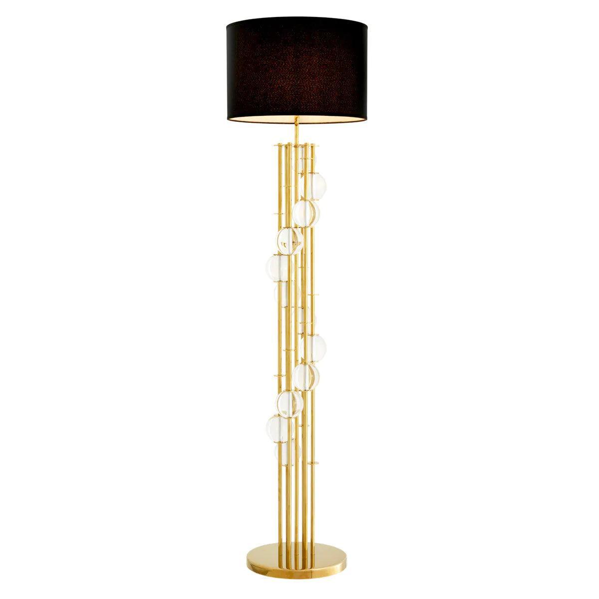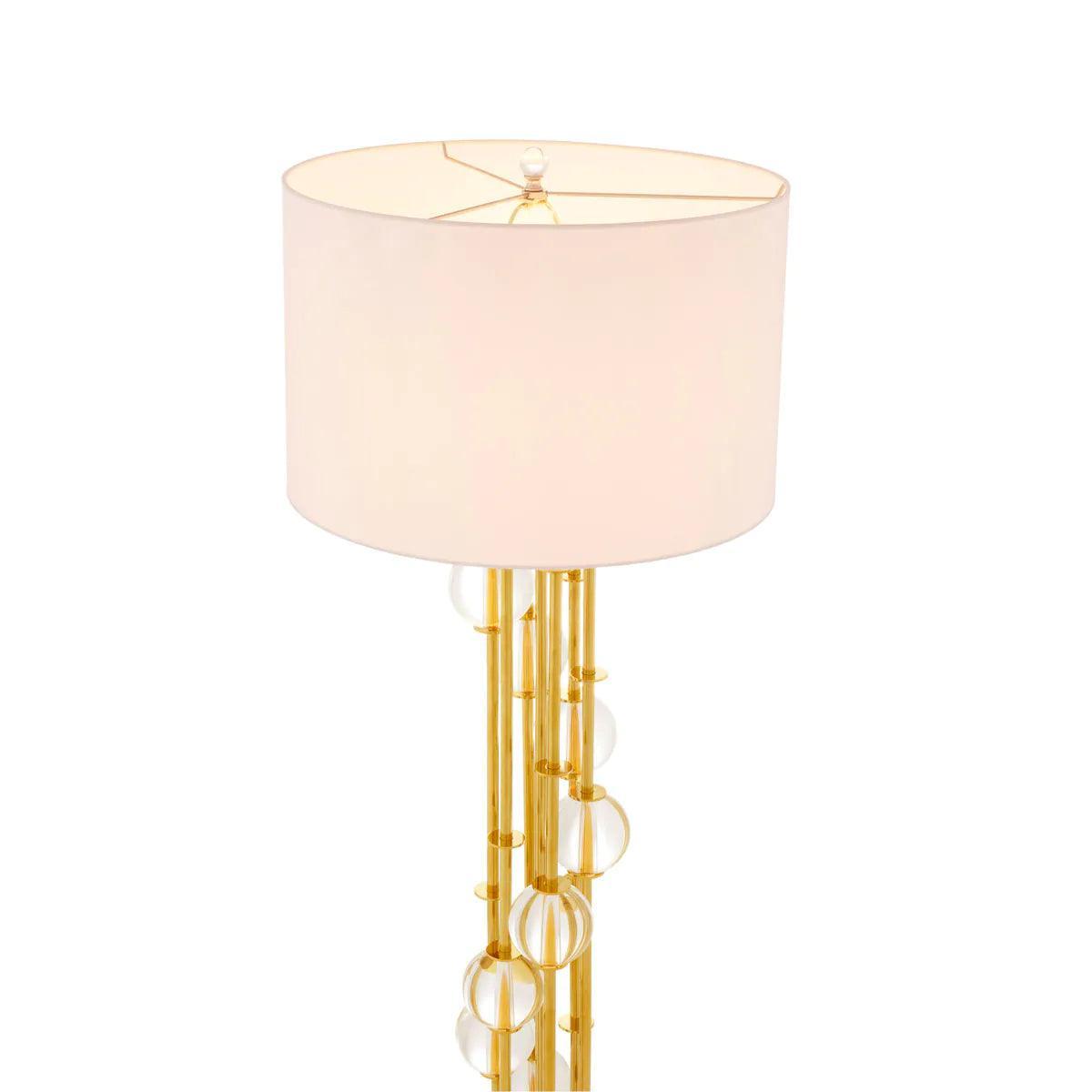 Spiraling twelve clear crystal glass balls on a sculptural steel frame, the Lorenzo floor lamp has an eye-catching design. This stylish and modern floor lamp features a polished gold finish and a round fabric lampshade. Available with a black or white lampshade.