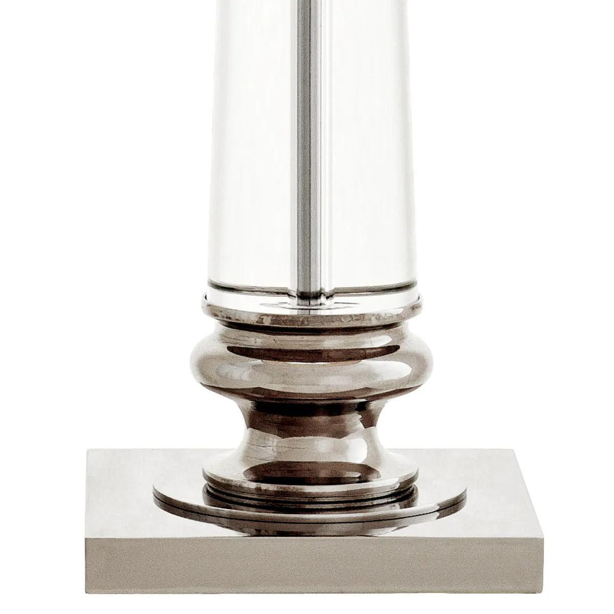 This elegant lamp consists of a cylindrical body made of crystal glass, a nickel-plated square base and a full-length stem. It is equipped with a beige conical shade to ensure minimal color contrast. A modern addition to the designer style.