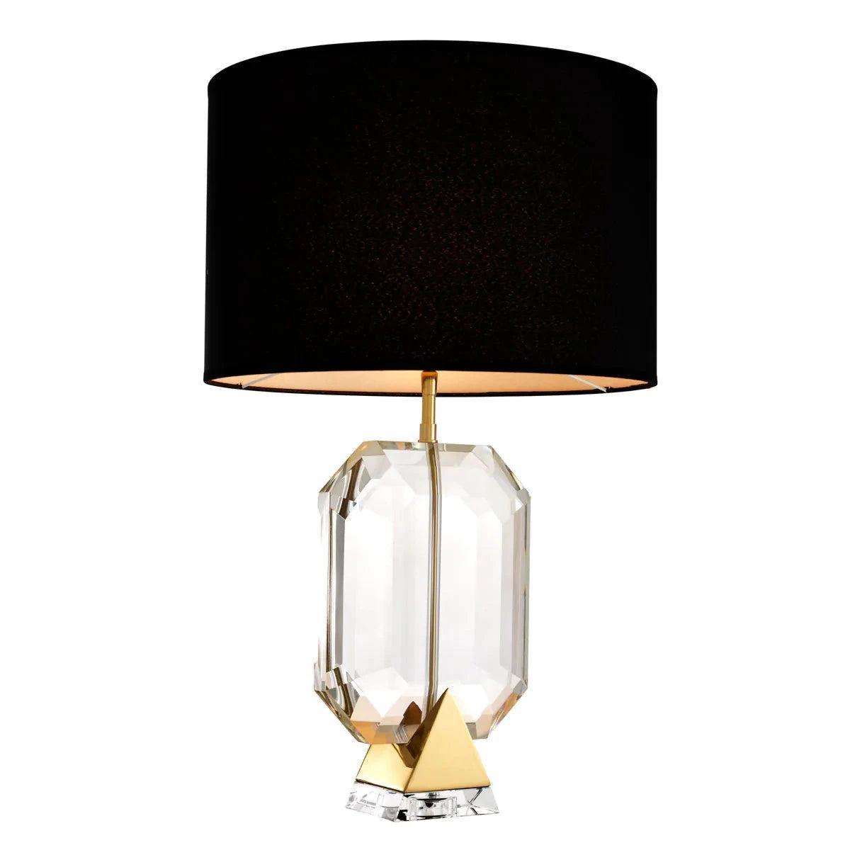 This beautiful, clear crystal glass light fixture is inspired by the emerald cut of precious diamonds. It is mounted on a gold-plated triangular base and comes with a round black or white fabric lampshade.