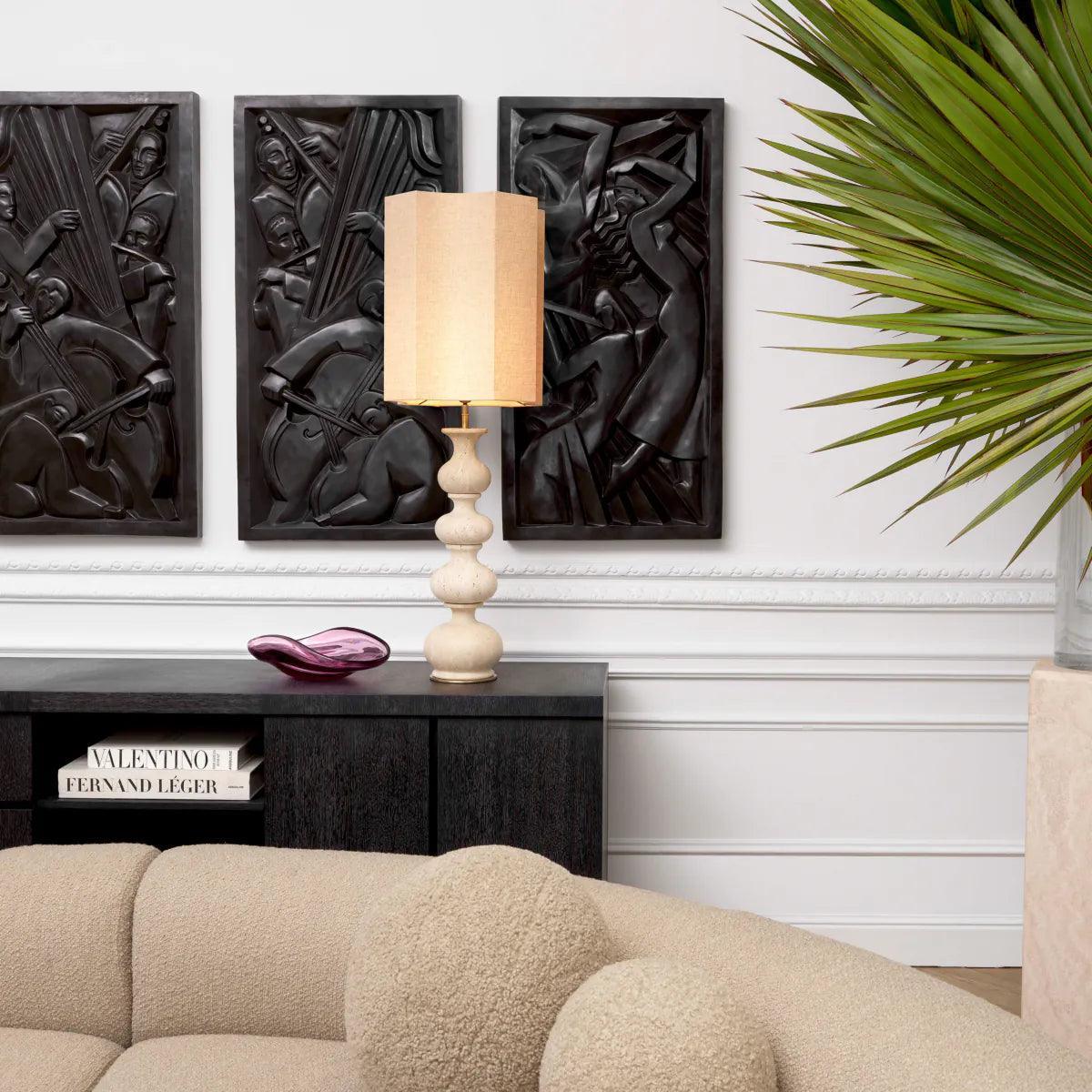 It has a distinctive beige limestone base that looks like an elegant vase. The antique brass and linen blend shade beautifully complements the limestone base.