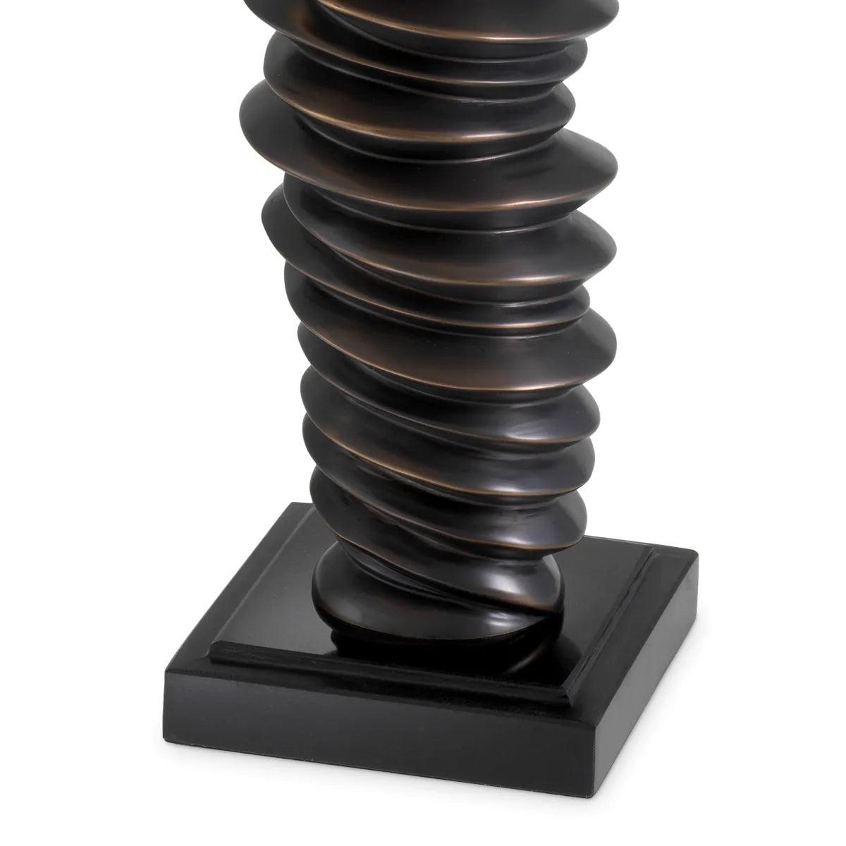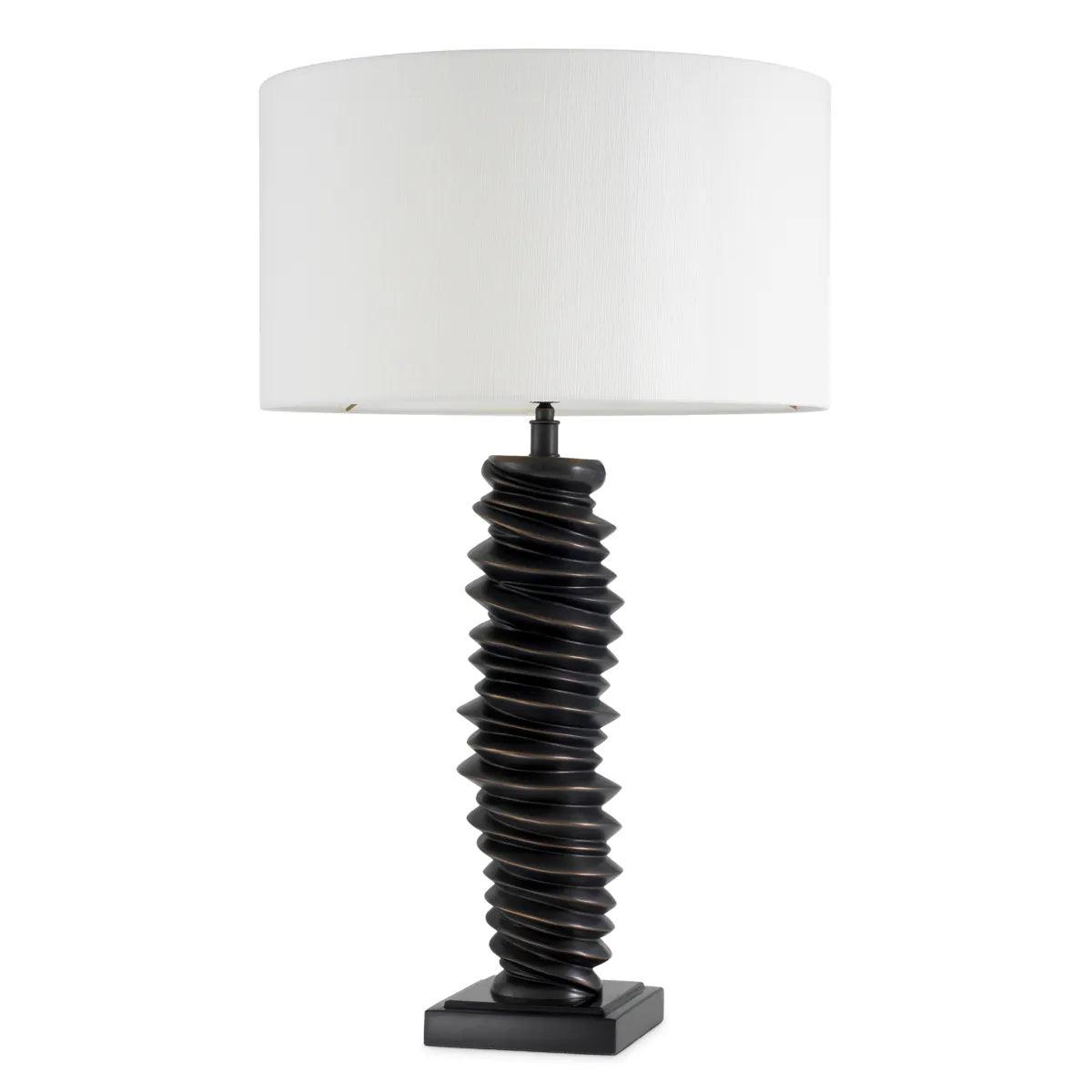 The Miro table lamp features a solid brass body with a bronze finish that is a work of art in itself. The tall, flat body, resembling a pile of stones, sits on a square base of polished black granite. This luxurious piece features a circular shade in an off-white shade.
