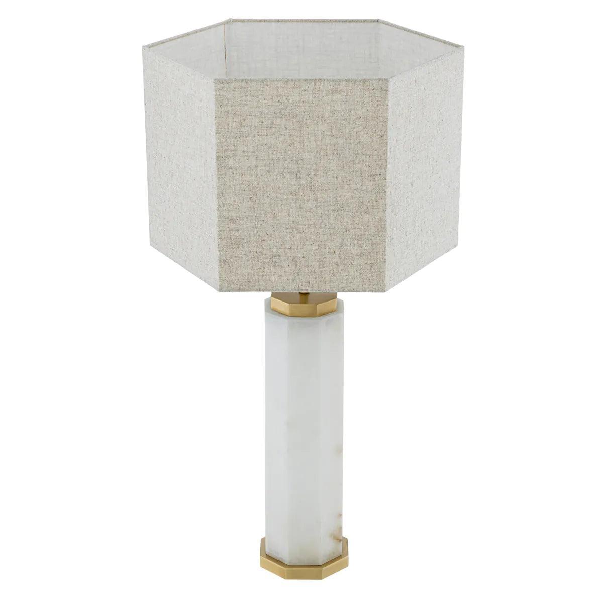 The Newman table lamp is known for its elegant design, unique patterns and textures. It features an octagonal, white alabaster plaster column base. The hardware is made of antique brass for a classic look, and the shade features a linen blend that complements the natural tones of the plaster. The Newman table lamp is the perfect choice to bring style and light to any room.