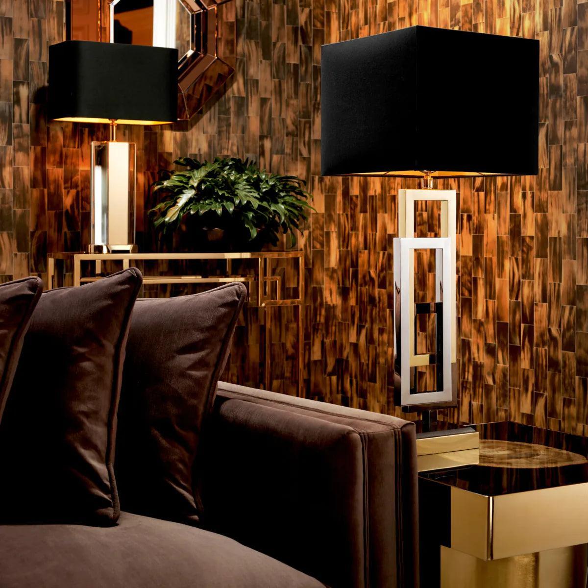 The sculptural lamp consists of a rectangular frame in three sizes, with different glossy finishes such as black, silver and gold. It is available with a large black lampshade.