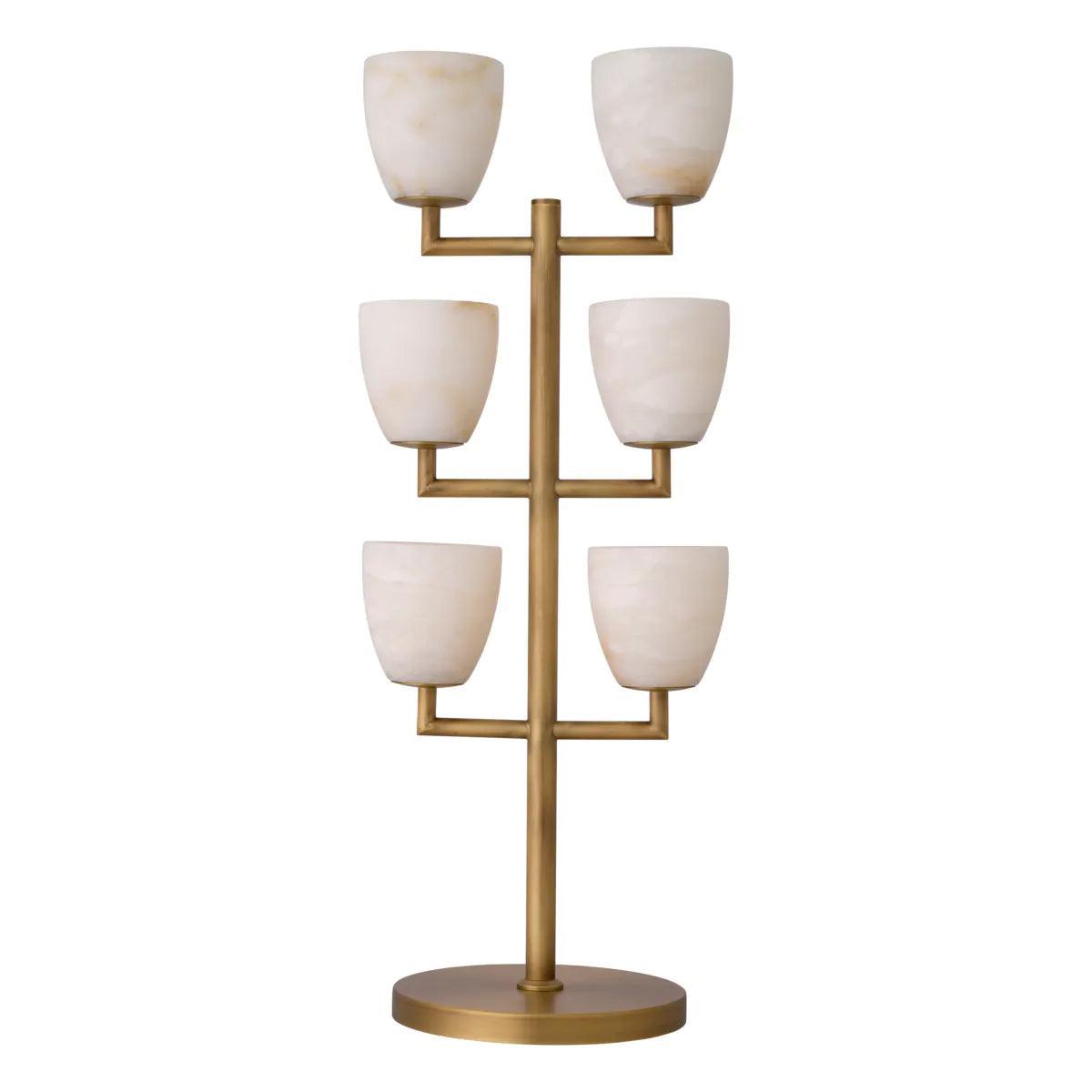 With its clean candelabra-style frame and round antique brass base, the Valerius table lamp features six lamps that add a pleasant glow to any room. The alabaster plaster lampshades, complemented by translucent shades, present a sharp and modern design. Its imposing size will brighten up any space and add a special atmosphere.