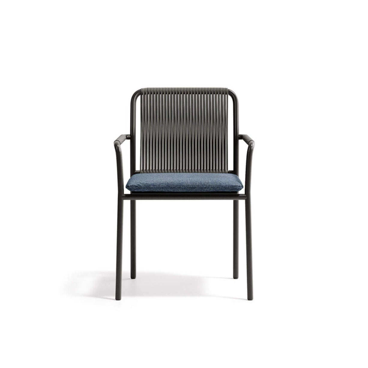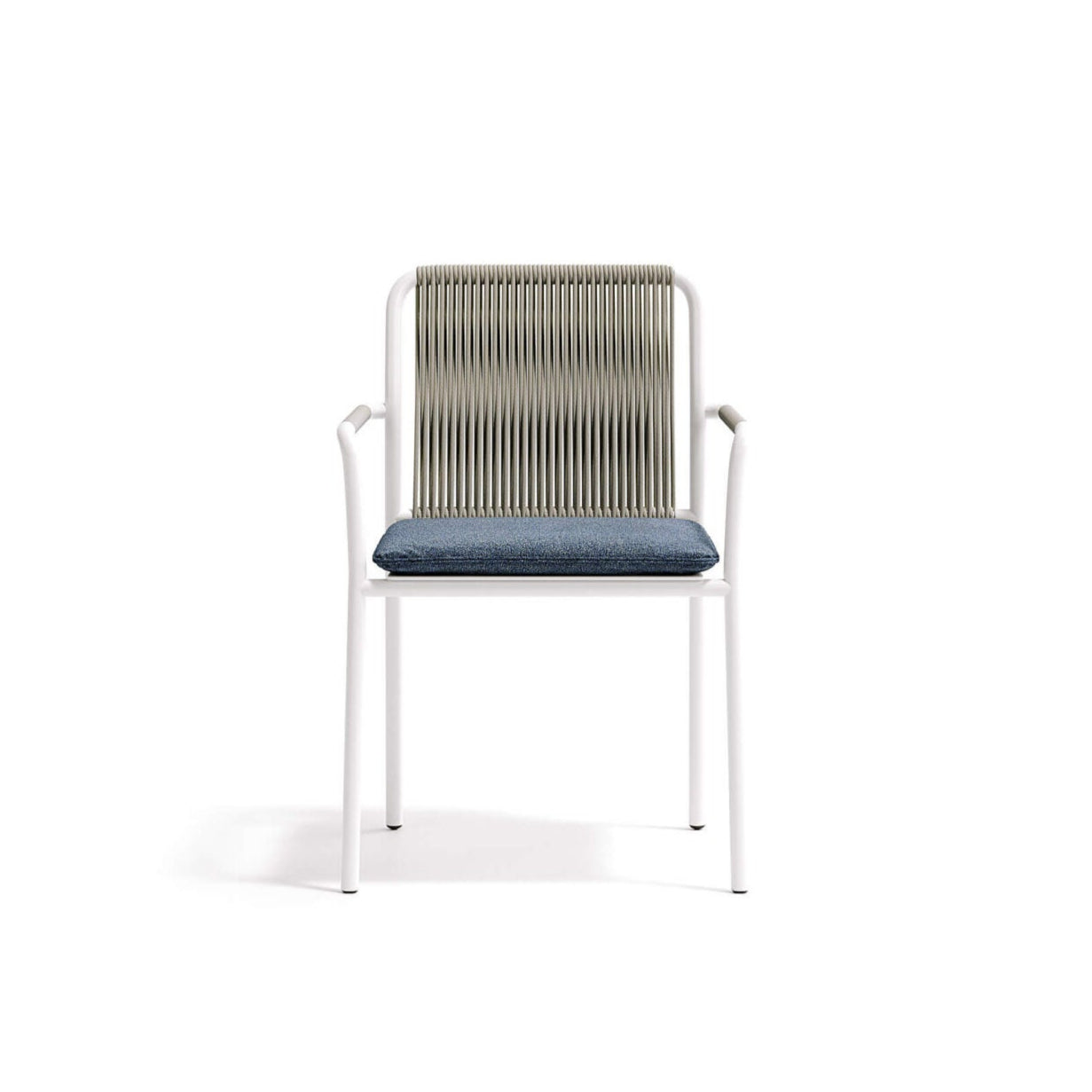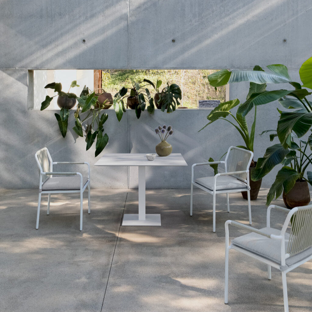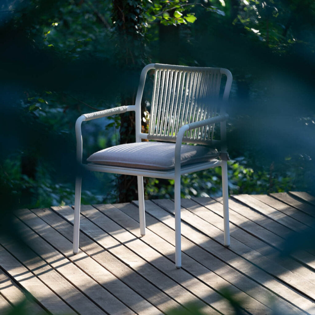 The scent of fresh air and timeless taste: this is the inspiration that unites and characterizes the Air collection. The solid white or graphite aluminum frame flows airily, embracing the seat with clean, geometric lines, decorated with a handmade weave that also forms the backrest and lends elegance to the armrests.