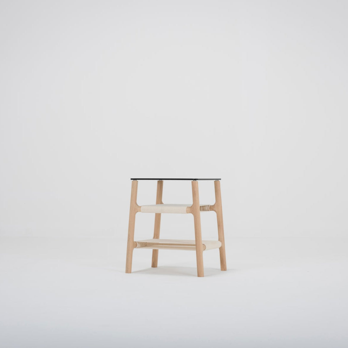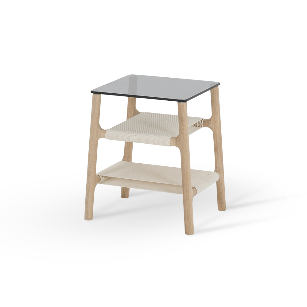 The Fawn end table serves as an elegant centerpiece, ideally suited to open and spacious interiors. Meticulously crafted from solid oak, its slender frame has fluid contours that embody grace and sophistication. Fawn is thoughtfully designed with hand-knitted cotton rope, offering a clever storage solution for everyday essentials like remote controls and magazines.