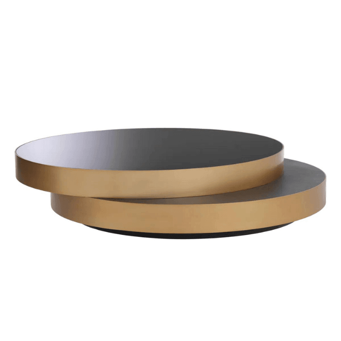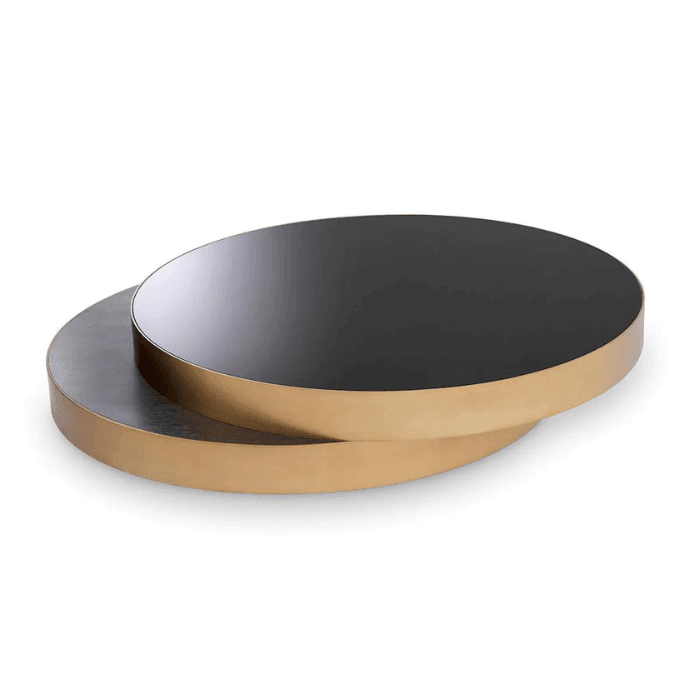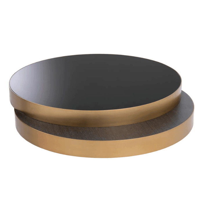 Create an extravagant new look for your living room with the Griffith glass coffee table. This unusual design features two stacked discs with a brushed brass edge. The lower disc has a dark oak veneer top, while the upper disc is made of black glass. The unique shape and color of the table immediately attract attention, while the combination of brass and wood exudes warmth and elegance. An ideal choice for modern and unique interiors, where design and function meet.