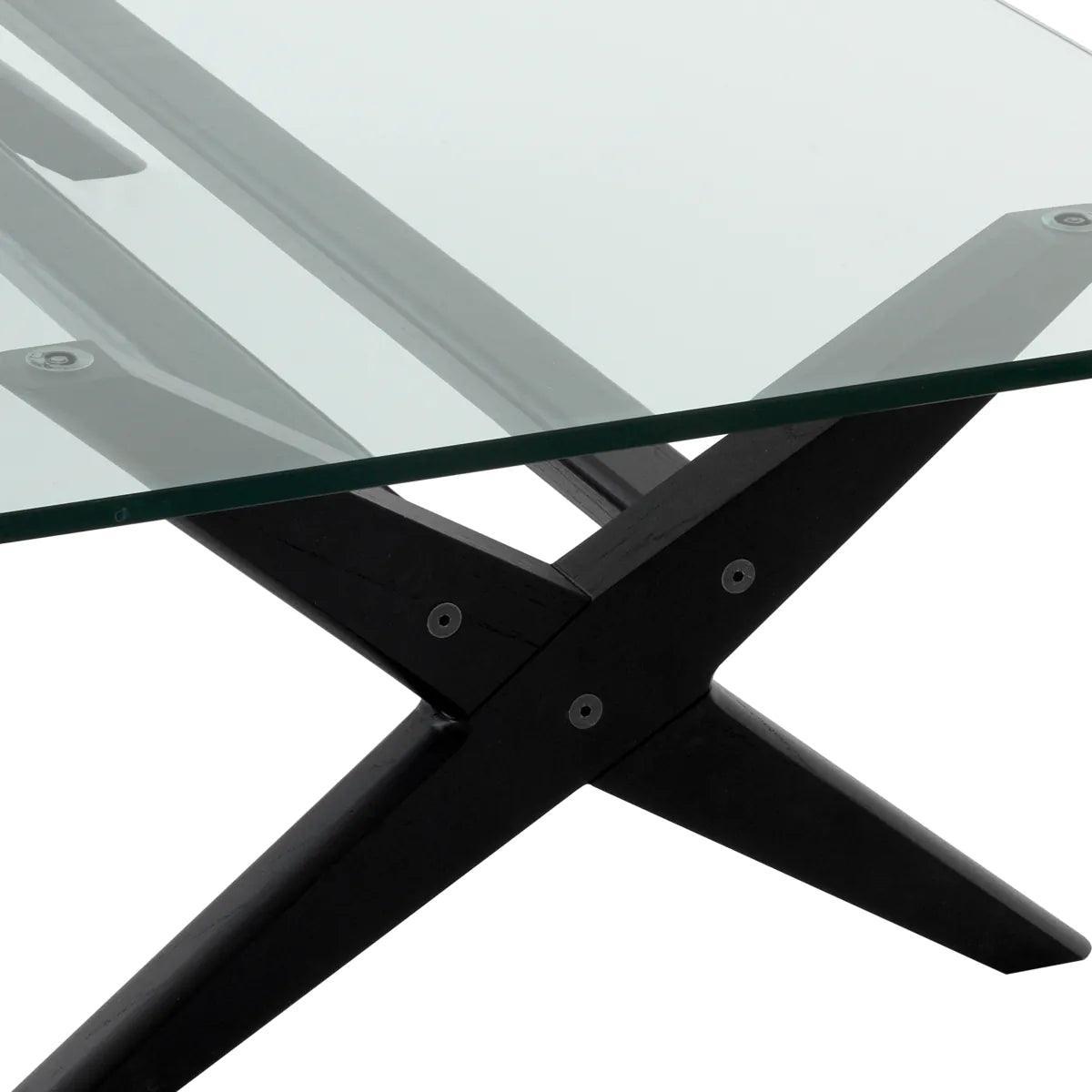 The classic black Maynor glass coffee table combines simplicity and quality. It is reminiscent of the iconic Chandigarh furniture of the 1950s and 1960s. Its solid wooden base is complemented by a thick, clear glass table top. This solid coffee table carries the X-shaped legs of the minimalist design popular at the time. A perfect choice if you love minimalist interiors, where simplicity meets functionality. The table's clean lines and solid material make it an instant focal point in any room.