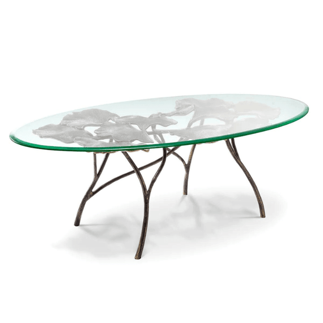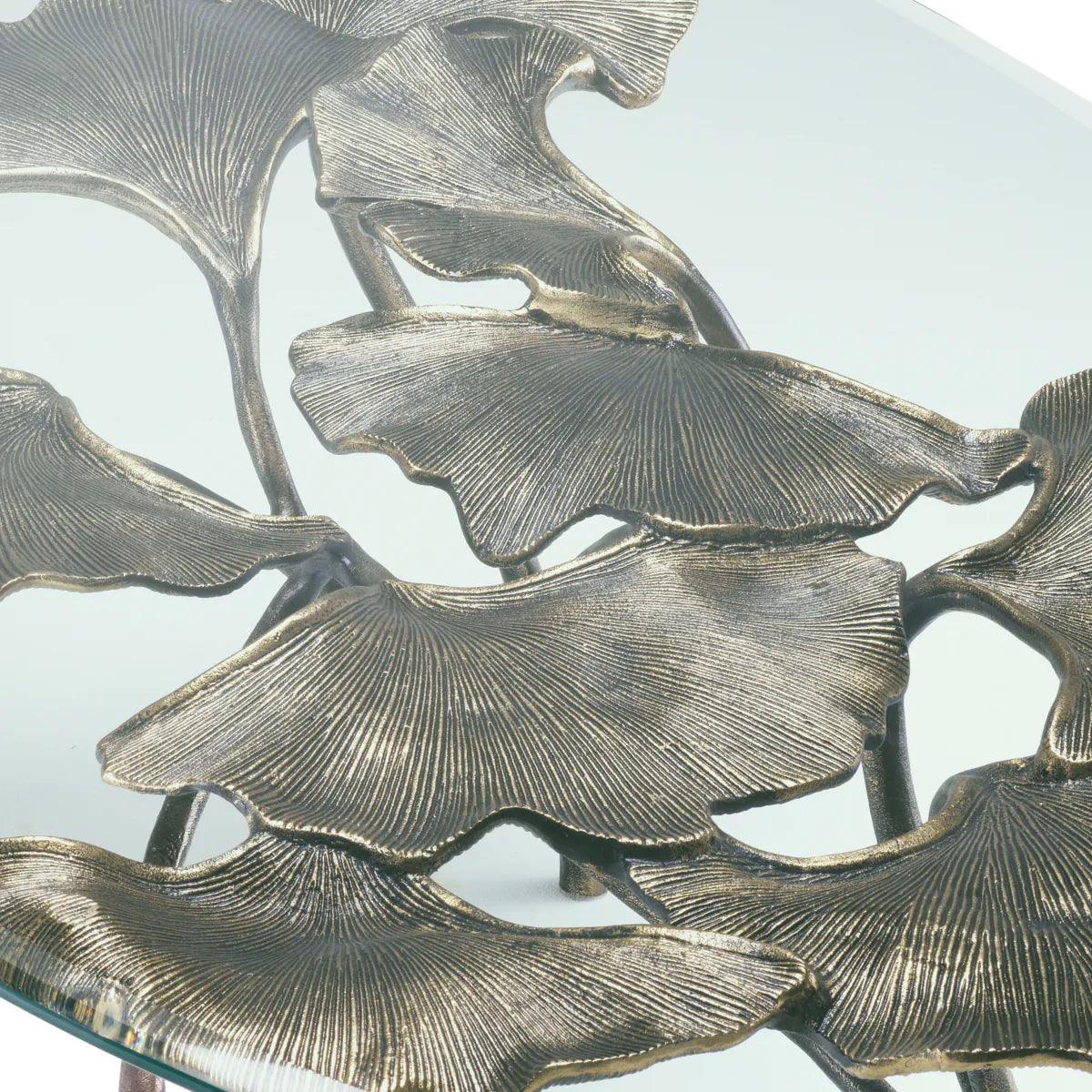 The Poseidon Glass Coffee Table is a remarkable work of art in one. The coffee table's frame is made of a charming ginkgo leaf pattern with a vintage brass finish, covered with clear glass. The Poseidon Glass Coffee Table will become a stunning centerpiece in any living room. Embrace the elegance and charm of this coffee table to create a stylish and sophisticated oasis in your home. A perfect choice if you love nature-inspired furniture.