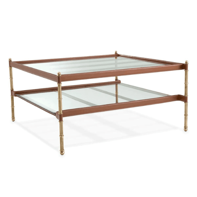 The Princess Glass Coffee Table will add a light and airy feel to your living room and a stylish elegance to any room. The four slender legs are finished in a vintage brass finish and decorated with end knobs, while the table top and bottom shelf are made of beveled clear glass. The leather straps bring to life the art of horse riding. Whether you're decorating your living room, study or office, the Princess Glass Coffee Table is sure to draw attention and appreciation. The genuine leather covering and vintage brass finish create a focal point that exudes sophistication and elegance.