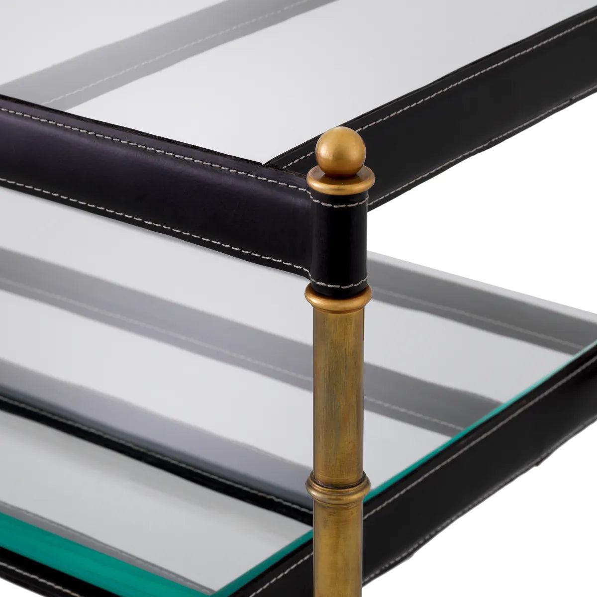 The Princess Glass Coffee Table will add a light and airy feel to your living room and a stylish elegance to any room. The four slender legs are finished in a vintage brass finish and decorated with end knobs, while the table top and bottom shelf are made of beveled clear glass. The leather straps bring to life the art of horse riding. Whether you're decorating your living room, study or office, the Princess Glass Coffee Table is sure to draw attention and appreciation. The genuine leather covering and vintage brass finish create a focal point that exudes sophistication and elegance.