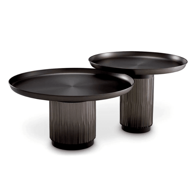 The Zachary metal coffee table set consists of two beautifully designed coffee tables. Each coffee table has a round tabletop with a black surface and a raised edge. The cylindrical, frosted glass base is decorated with a simple, linear relief. This versatile coffee table set will be a great addition to any living room or lounge. A perfect choice if you like modern and clean design elements. The combination of metal and glass provides an elegant and timeless look.