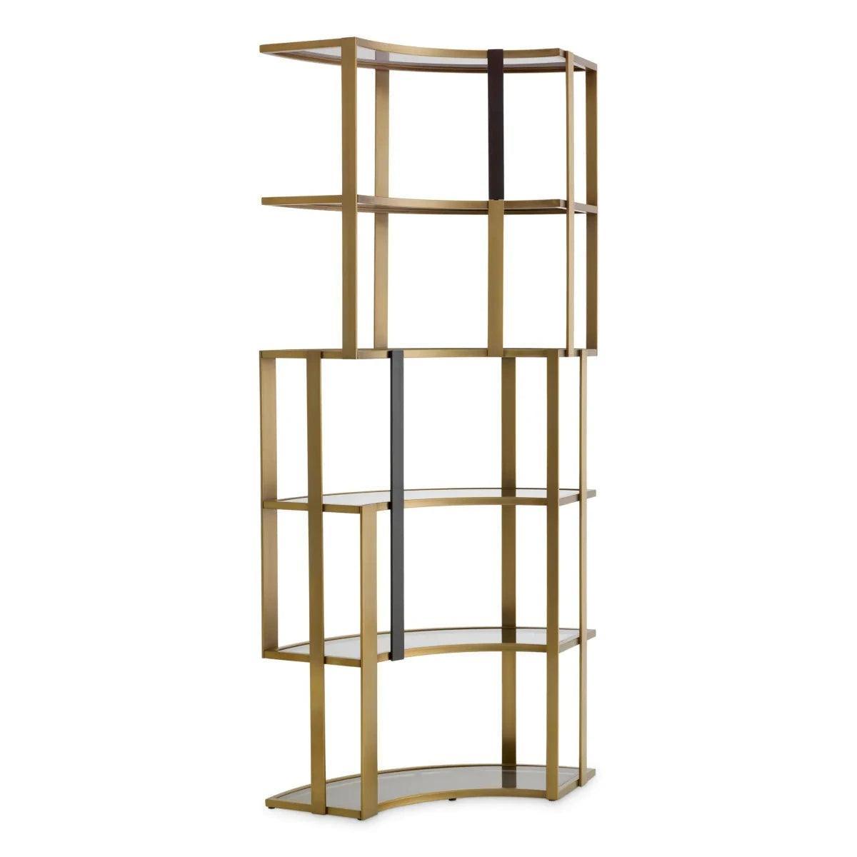 Thanks to its clean and open design, the Clio glass corner shelf fits perfectly into modern homes. The solid, metal bookcase is partly coated in matte black and partly in brushed brass. It has six smoked glass shelves, where you can easily place your books, decorative items, favorite photos or even plants. Combine it with other pieces from the Eichholtz Clio furniture family for the perfect overall effect!