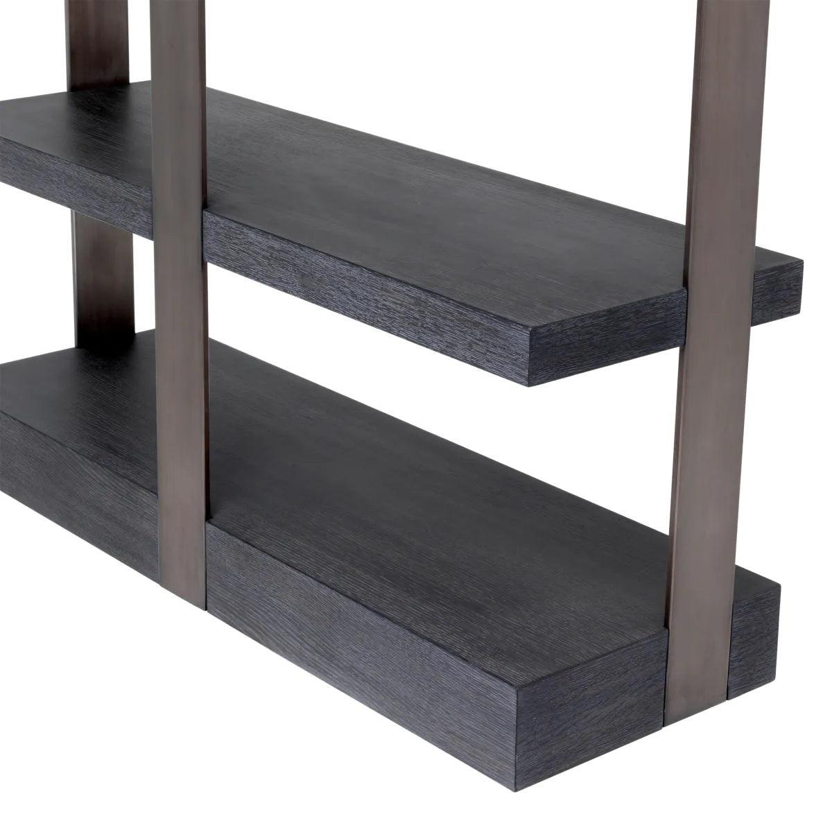 The Geo wooden shelf with bronze frame is a stylish and practical storage unit, an essential accessory for modern homes, which is truly practical in any room. Its solid metal frame has a bronze finish and contains six dark oak veneer shelves. Perfect storage for your plants, books and pictures.