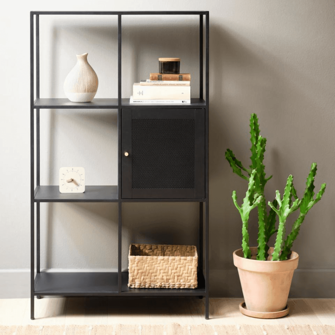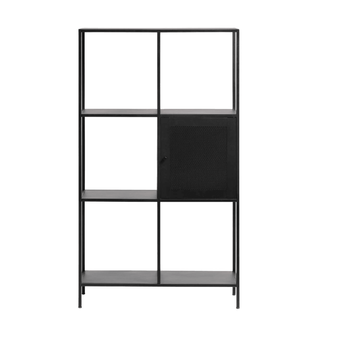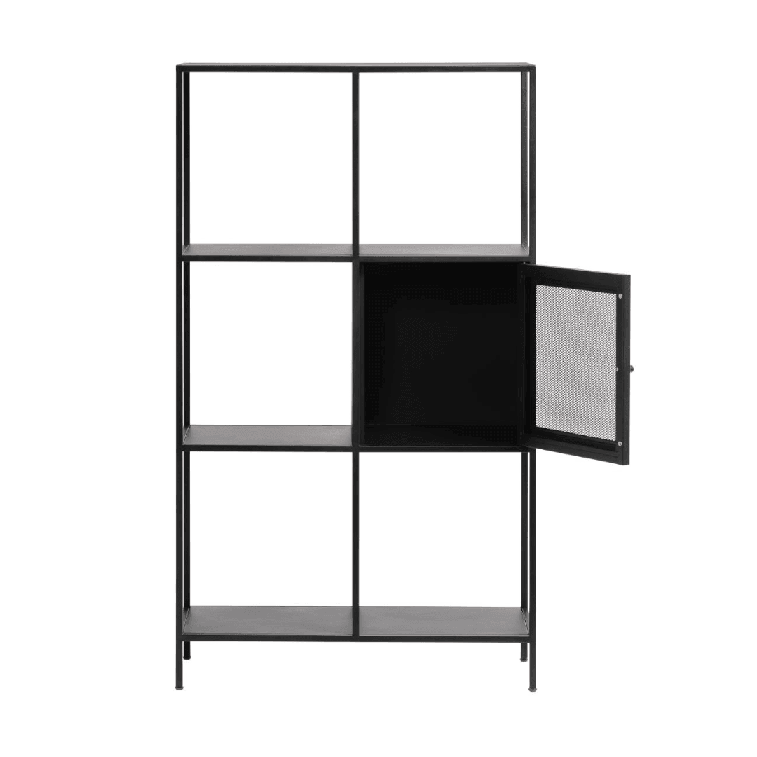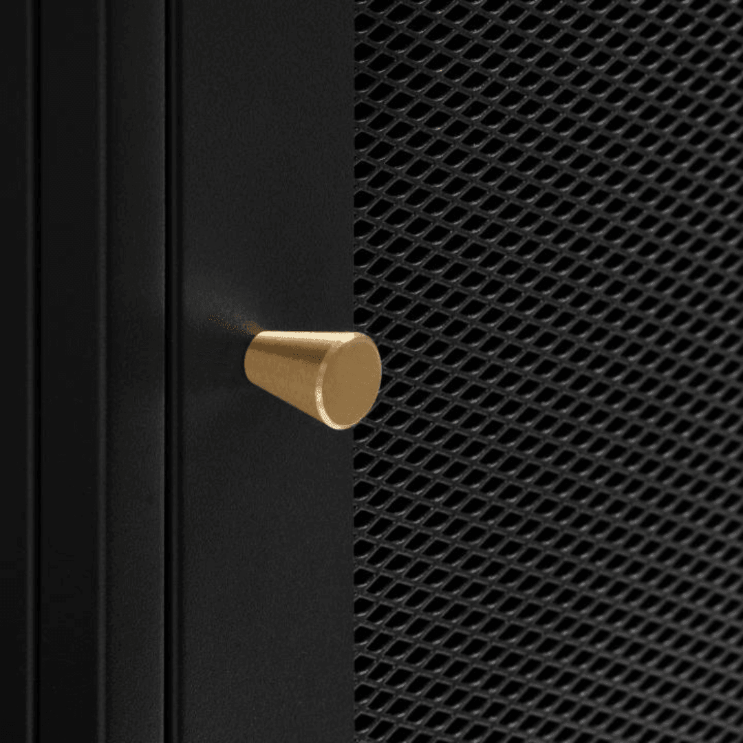 The Malibu metal shelf provides a versatile storage solution. Practical and decorative, making it a perfect choice for any home. It has a strong structure. It has one door with a metal mesh. The owner can choose from two types of door knobs: black or gold, so it can easily fit into the existing interior. Thanks to the practical storage spaces, you can create order and harmony in your living room, bedroom or study.