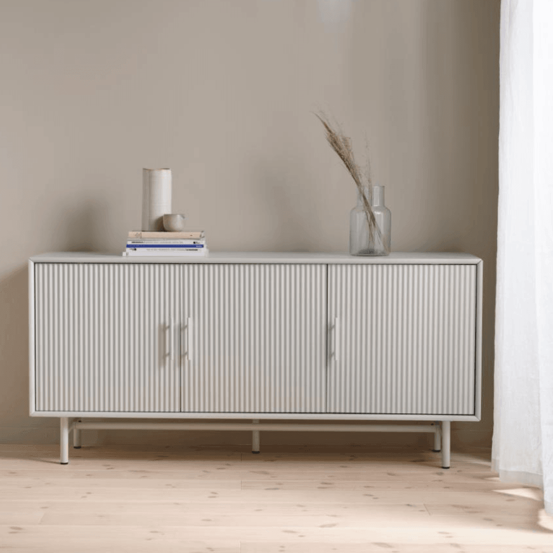 Elegant and stylish, this Palma wood cabinet is a perfect choice for any home. The cabinet is made of wood, while the legs are metal, but thanks to the uniform light gray color, it fits perfectly into any interior. The cabinet has 3 doors, providing plenty of storage space for personal items or decorative items.