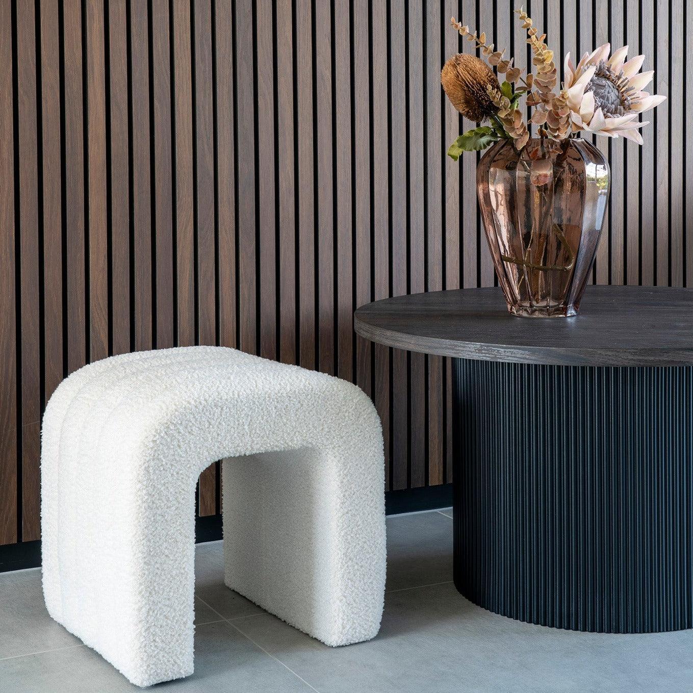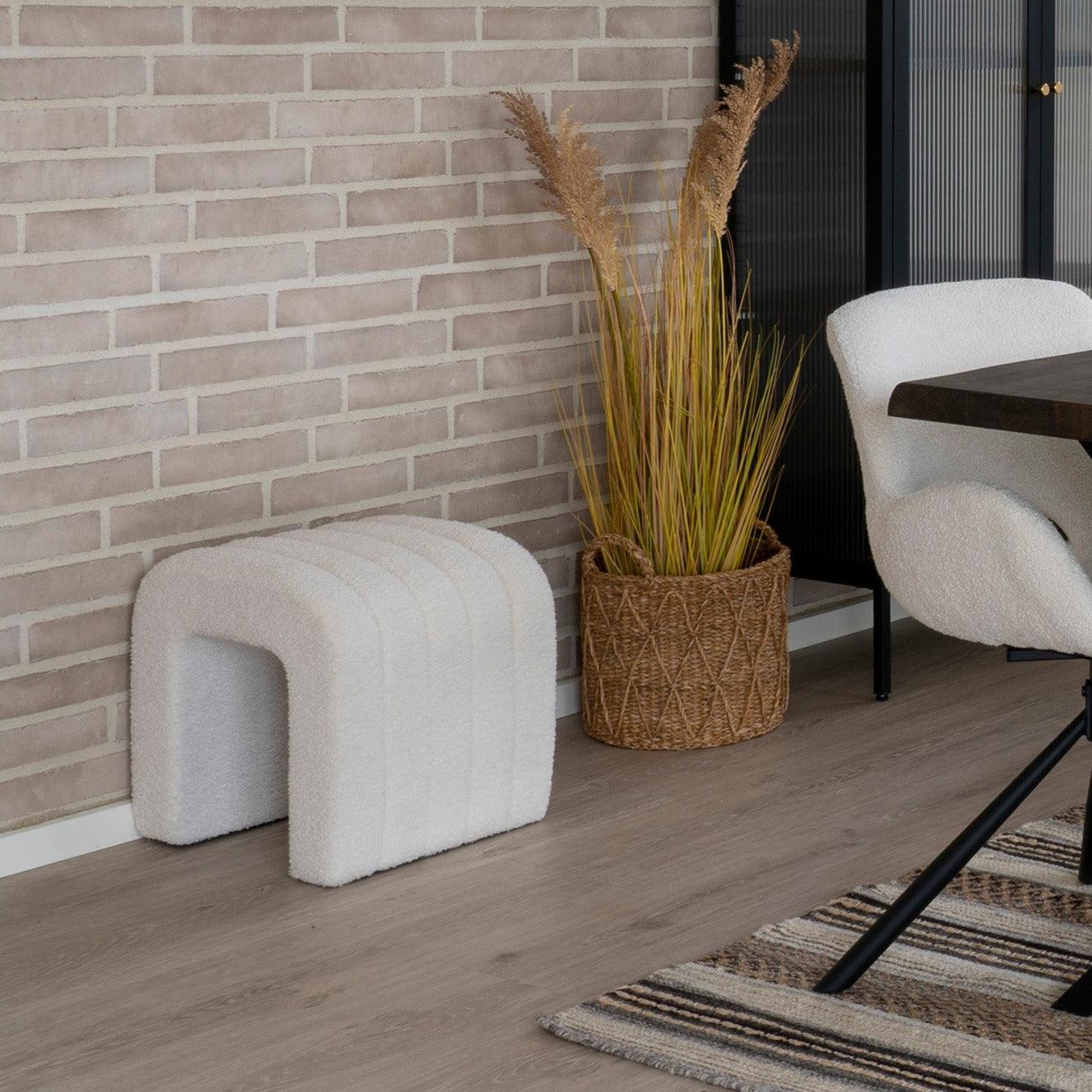 The Alphen buklé puff is the perfect combination of style and comfort! This trendy piece gives a stunning look to any space, be it living room or bedroom. The material of the pouffe has a luxurious beige bouclé design, while the black painted metal frame ensures stability and elegance.