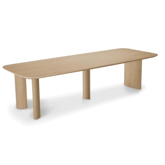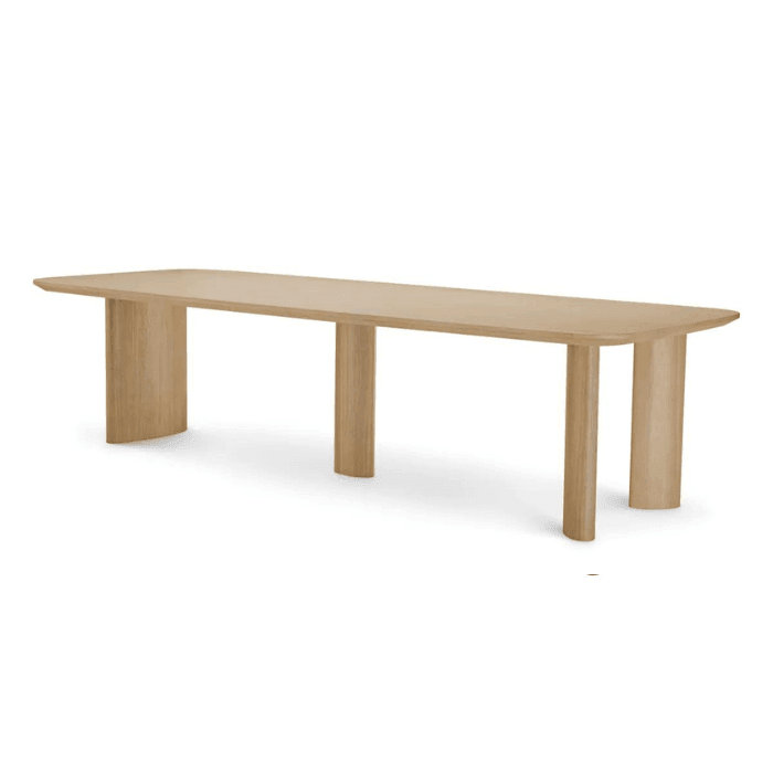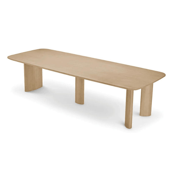 Discover the clean and modern design of the Harmonie wooden dining table in a large version. Its rectangular table top covered in oak veneer has rounded corners and elliptical legs, giving the table a unique style. It can be the perfect centerpiece for formal gatherings and casual meals alike. It fits harmoniously into any modern or classic interior. It creates an effortlessly elegant atmosphere for every meal.