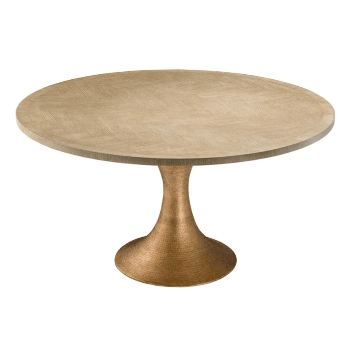 The Melchior wooden dining table collection evokes the Danish design of the 1950s, lending a real retro feel to your home. The Melchior wooden dining table with brass legs, in a round design, is made of high-quality veneer. It is a truly timeless and durable piece, lasting longer than solid wood, which warps or cracks over time. Its light brown oak veneer table top has a beautiful herringbone pattern. Its hourglass-shaped legs are brass-plated for a monochrome effect and to easily fit into various styles of interiors. A perfect choice for lovers of mid-century modern design!