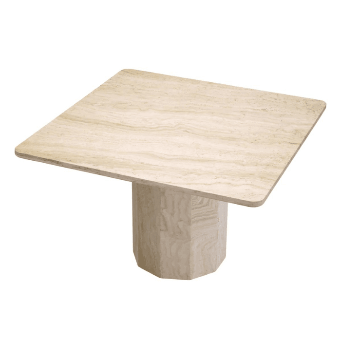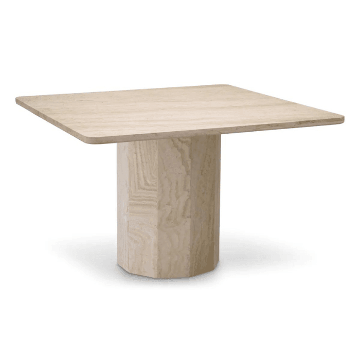 The Piazza limestone dining table is a masterpiece by Eichholtz, inspired by the trunk of a medieval Catalan column, circa 1130-40. With strong lines and a timeless appeal, the table showcases the beauty of natural travertine limestone. Each piece displays a unique color and texture. This piece is both historically significant and fits in with modern homes. Its quality construction ensures that this dining table will last a lifetime and be timeless.