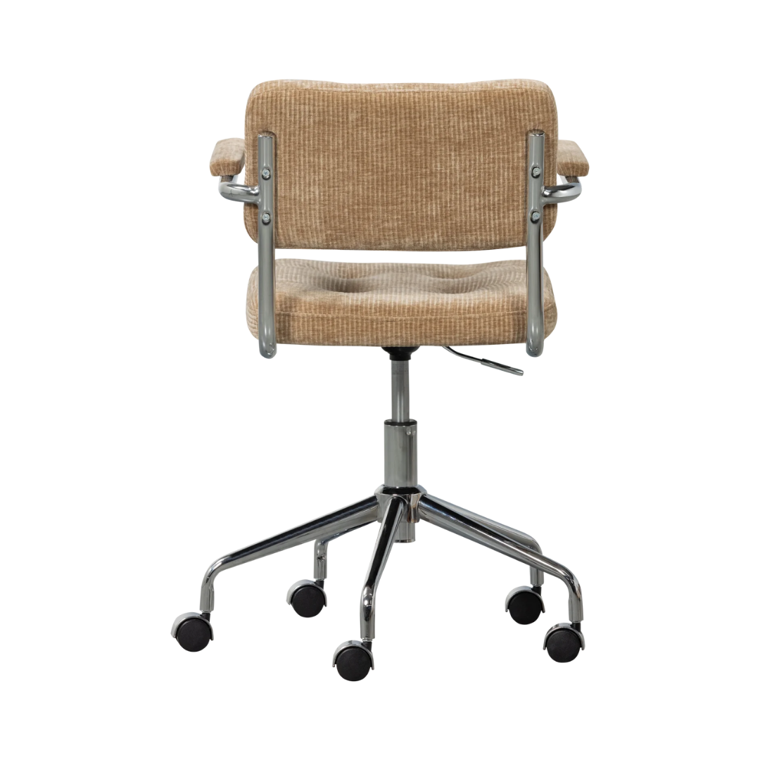 Tanulj vagy dolgozz stílusosan, a Kova irodai székünkkel, melyen kényelmesen ülhetsz az íróasztalánál. A Kova a holland Woood lakberendezési márka kollekciójából származik. A szék kerekekkel és egy karral rendelkezik az ülésmagasság beállításához. A szék világosbarna kordbársonnyal kárpitozott üléssel, háttámlával és karfákkal is rendelkezik, ez biztosítja a magas kényelmet.