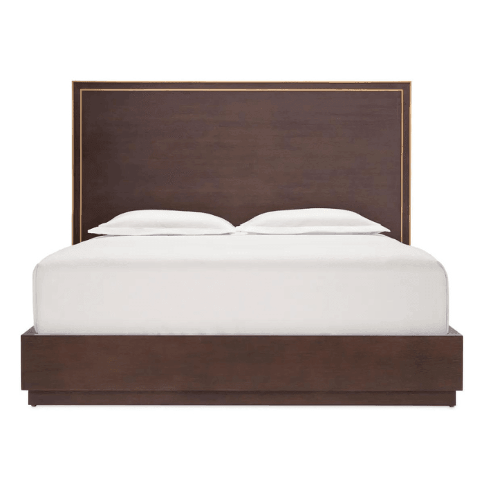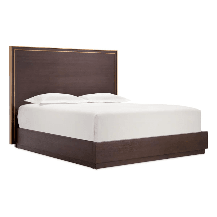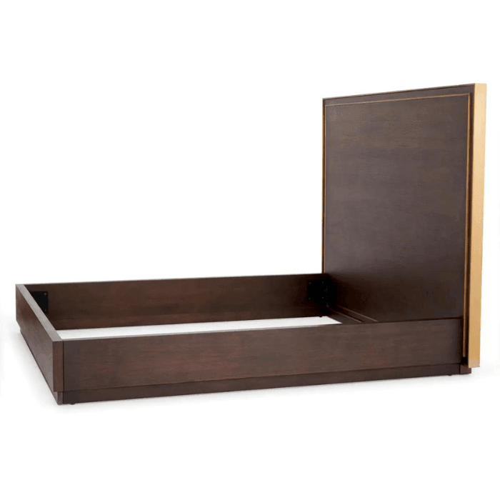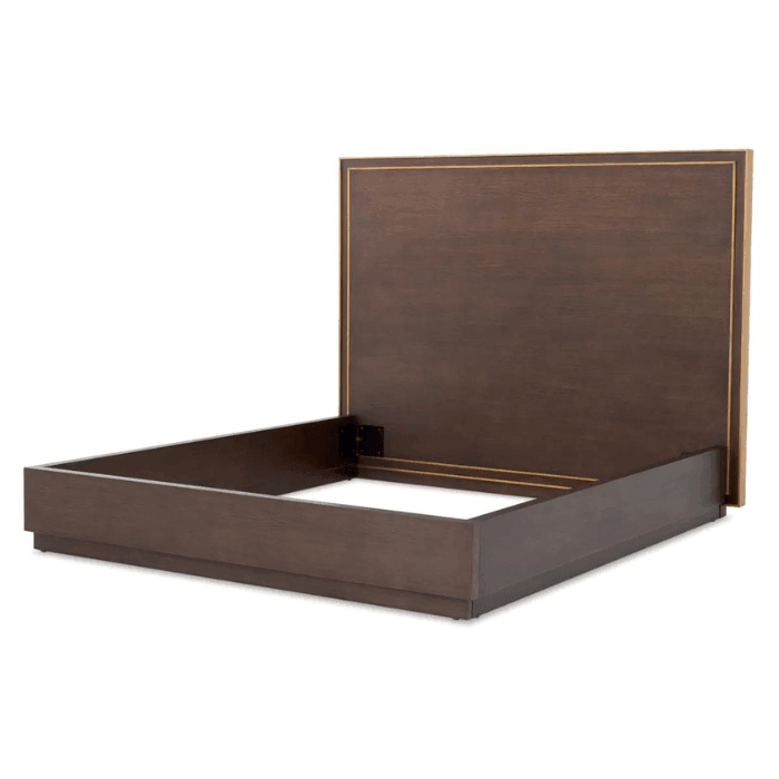 The Camelot bed frame, finished in brown oak veneer, stylishly combines contemporary design with retro appeal. This beautiful bed frame features a brushed brass trim and cover on the headboard, adding a truly elegant touch to your bedroom.