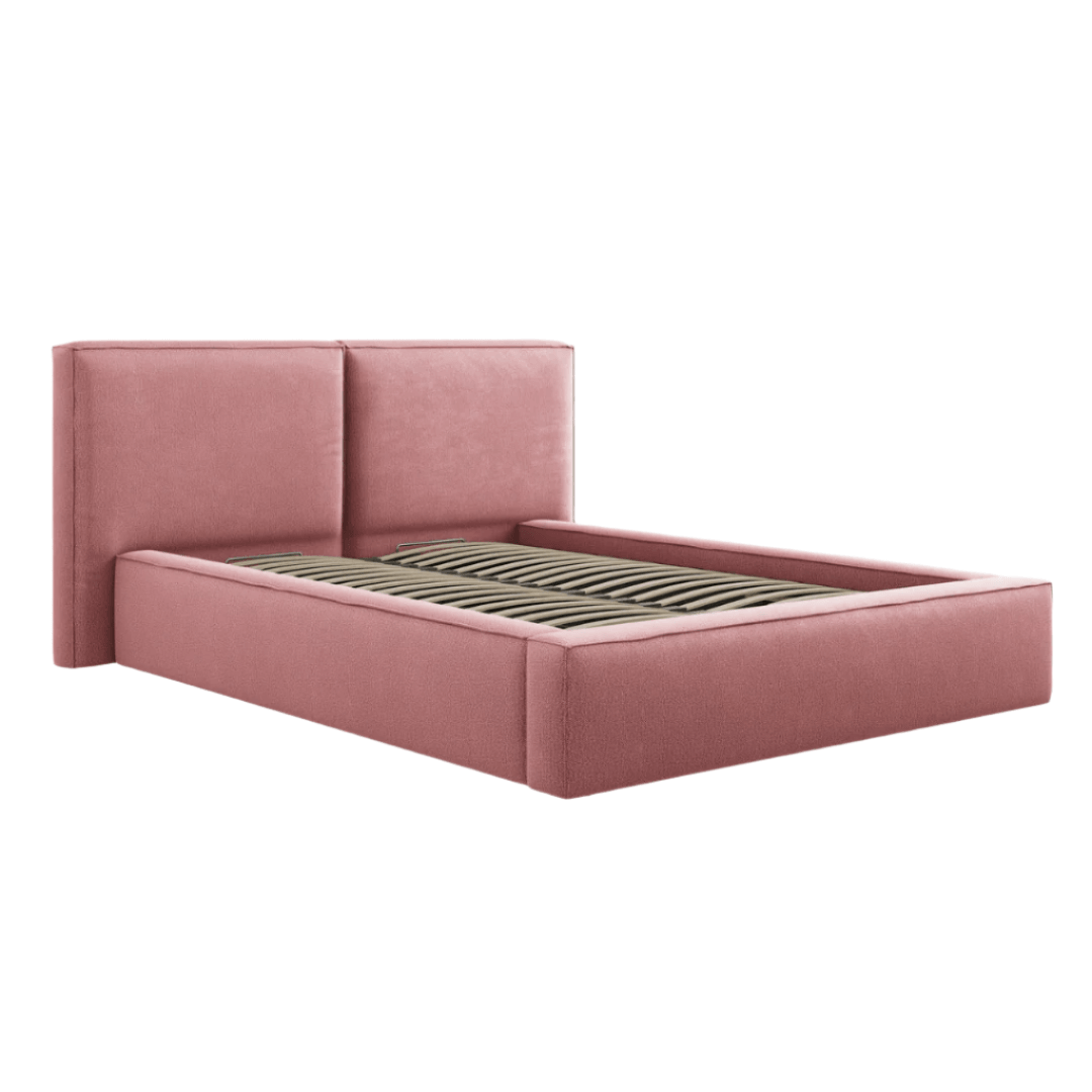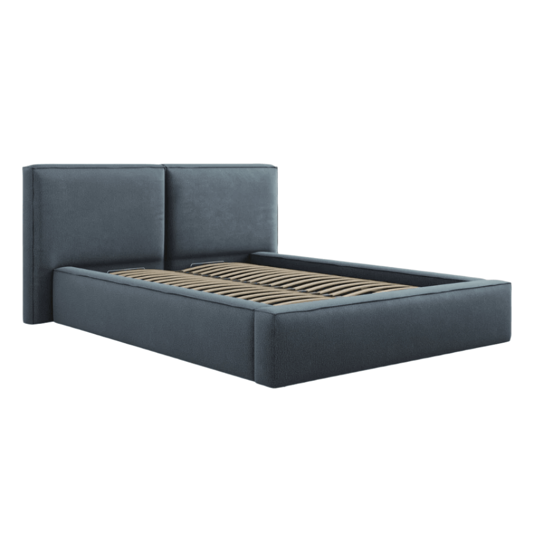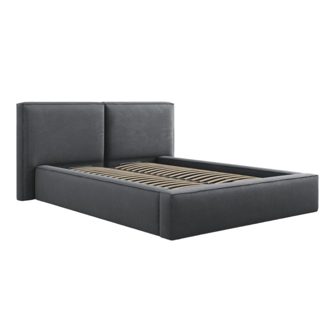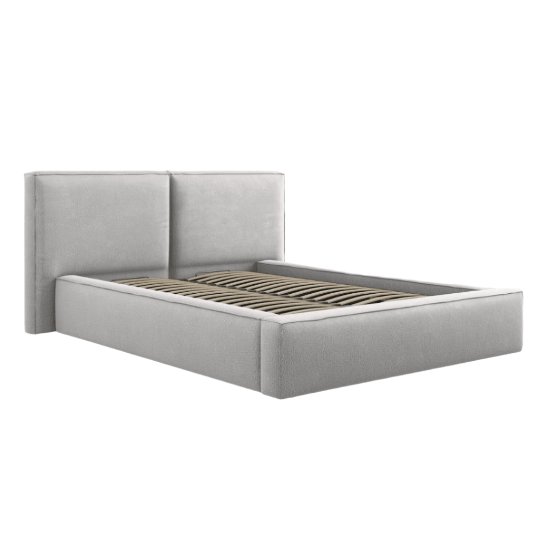 The sleek Jodie bed frame has a modern look with its beautiful silhouette. Its comfortably padded design guarantees complete relaxation. The contoured backrest and edged frame create a stylish harmony. Thanks to its elegant fabric upholstery and color selection, it easily fits into any bedroom. The lying surface is 140x200 cm, and there is a linen holder under the bed slats.
