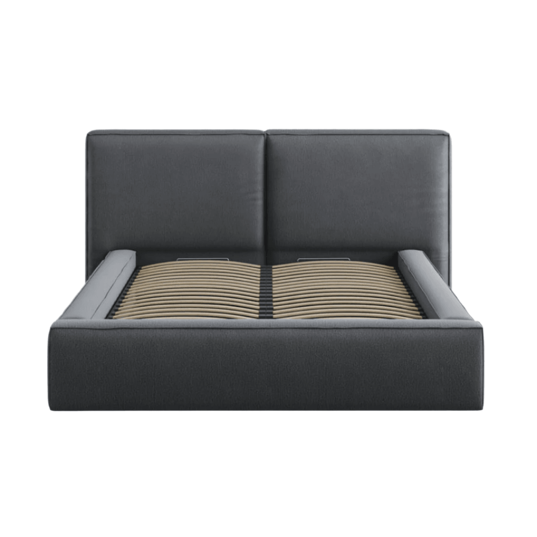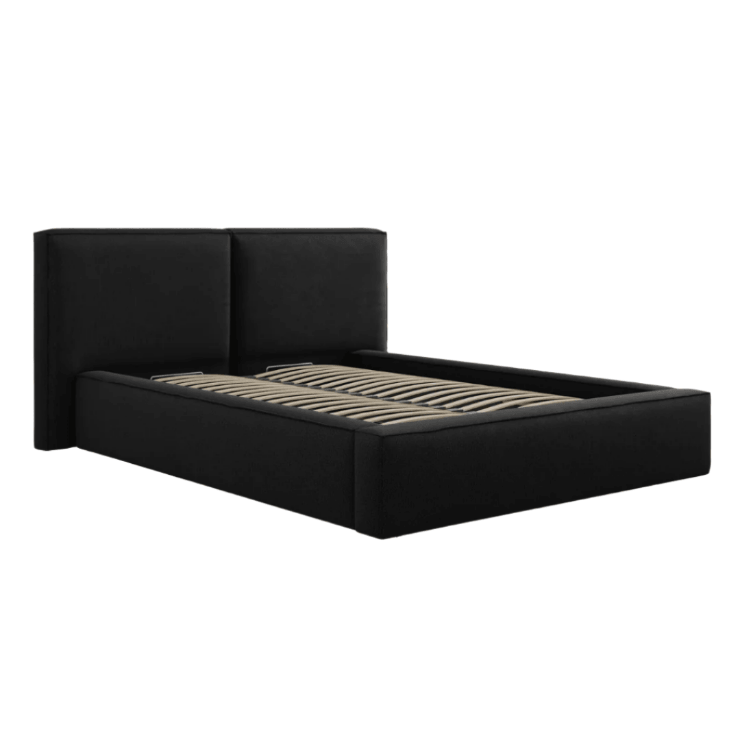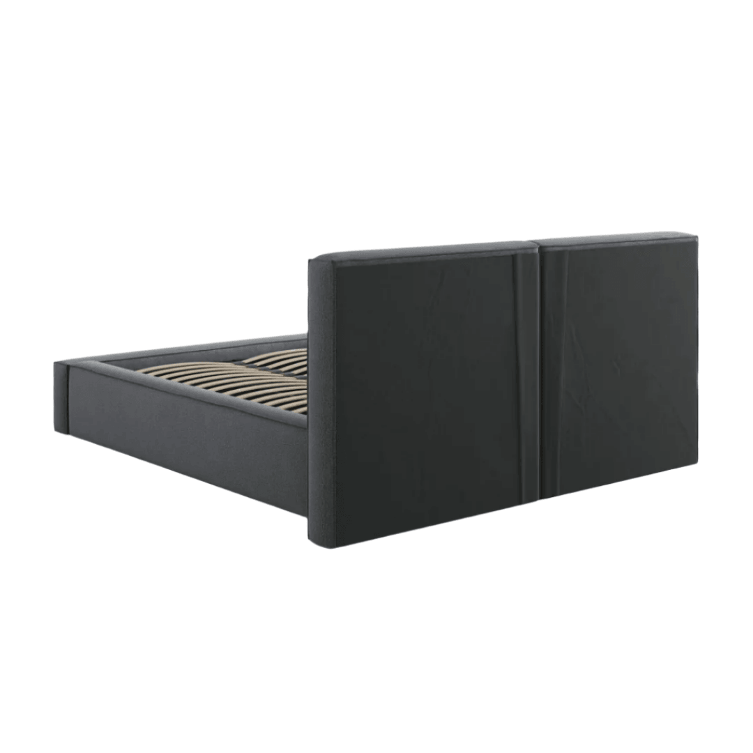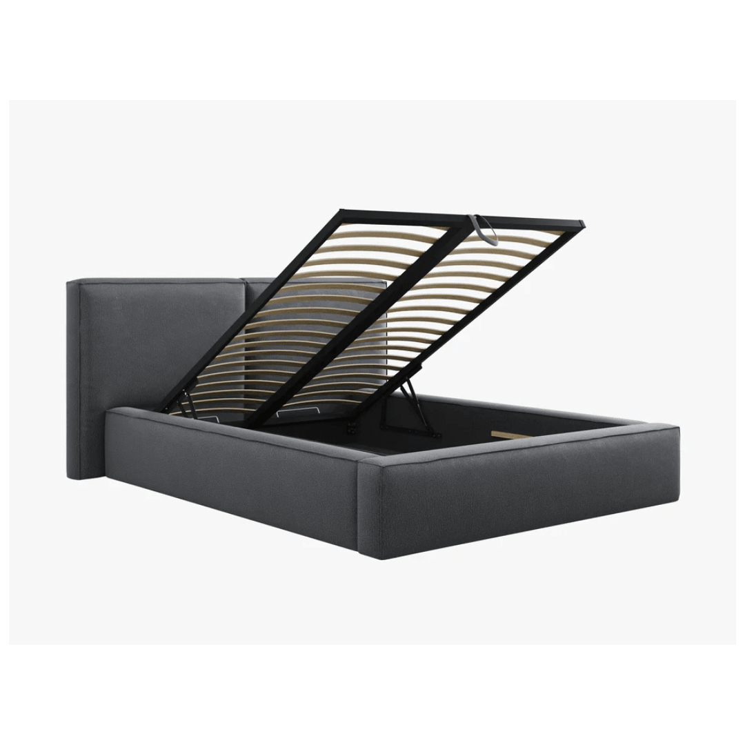 The sleek Jodie bed frame has a modern look with its beautiful silhouette. Its comfortably padded design guarantees complete relaxation. The contoured backrest and edged frame create a stylish harmony. Thanks to its elegant fabric upholstery and color selection, it easily fits into any bedroom. The lying surface is 140x200 cm, and there is a linen holder under the bed slats.