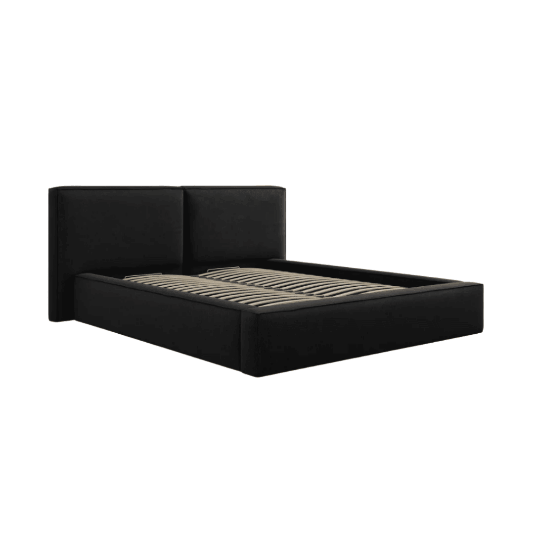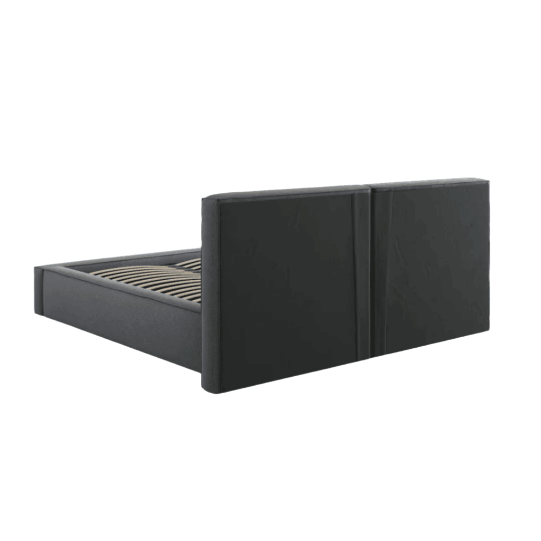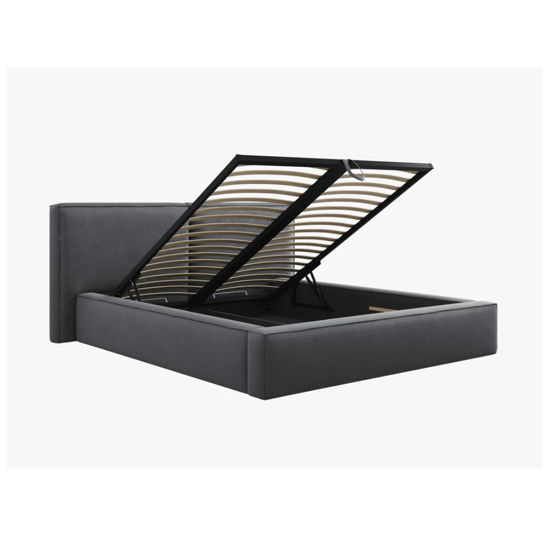 The sleek Jodie bed frame has a modern look with its beautiful silhouette. Its comfortably padded design guarantees complete relaxation. The contoured backrest and edged frame create a stylish harmony. Thanks to its elegant fabric upholstery and color selection, it easily fits into any bedroom. The lying surface is 160x200 cm, and there is a linen holder under the bed slats.
