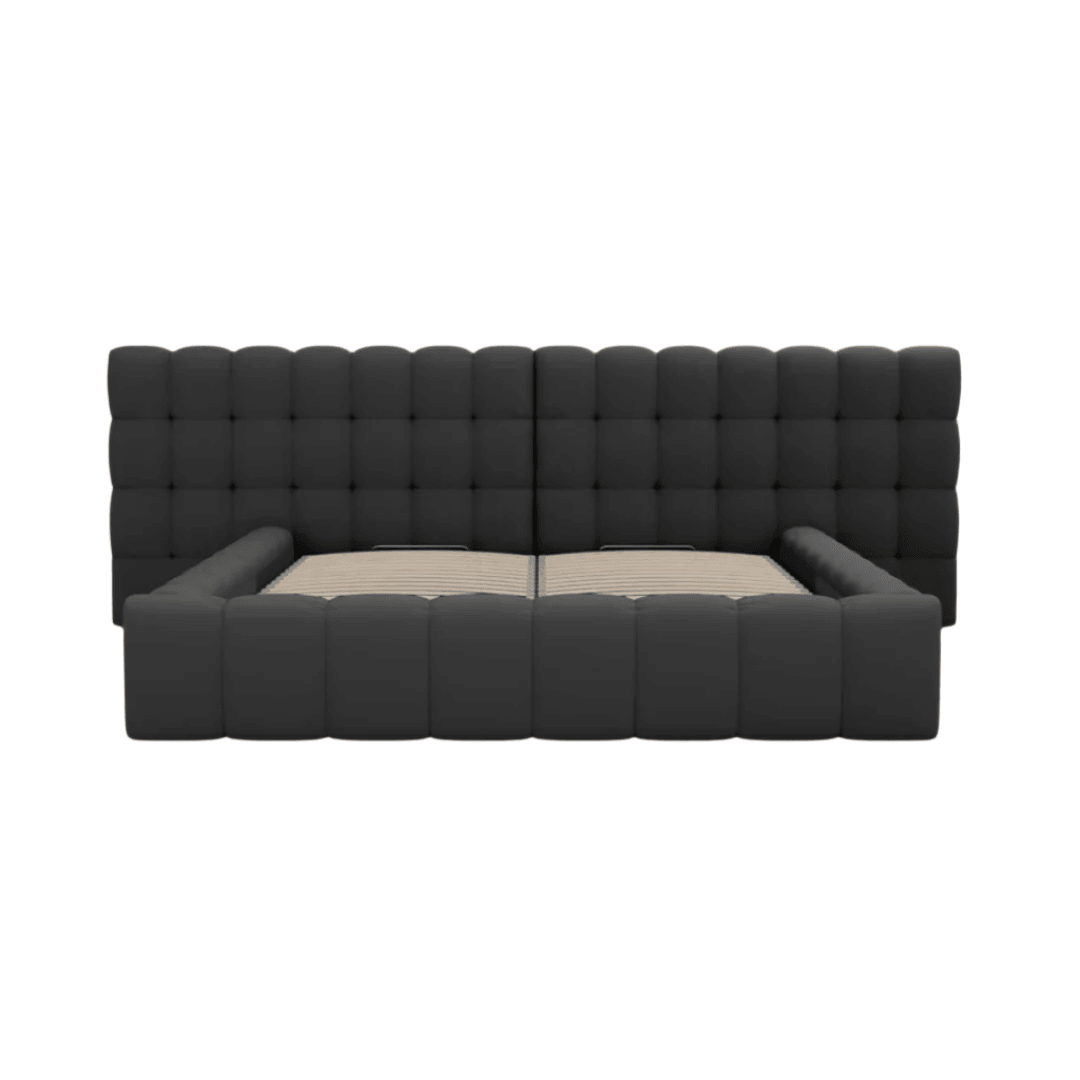 With its carefully quilted backrest and side elements, the Mamaia bed frame fills any interior with a unique, distinctive and positive energy. The luxurious upholstery made of soft, durable material and the wide headboard are the essence of modernity and elegance that will brighten up any bedroom. The lying surface is 160x200 cm, and there is also a linen holder under the bed slats. The Mamaia bed frame is available in seven fabric upholstery colors, four sizes and a narrow version.