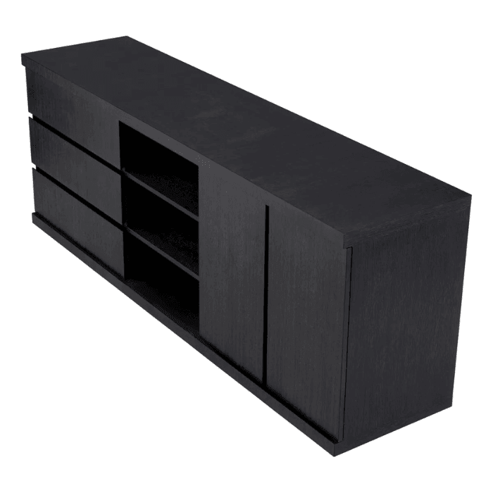 The Crosby wooden cabinet combines aesthetic modern urban style with high functionality. It is a great choice if you are looking for a more prominent piece of furniture for your home. With its simple but robust design, it is a perfect choice for contemporary interiors. In addition to the two-door shelf, it also has three drawers and three freely accessible shelves. Both the doors and drawers operate with a soft-close mechanism.