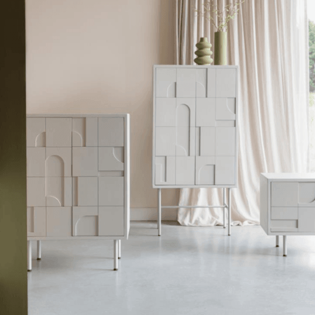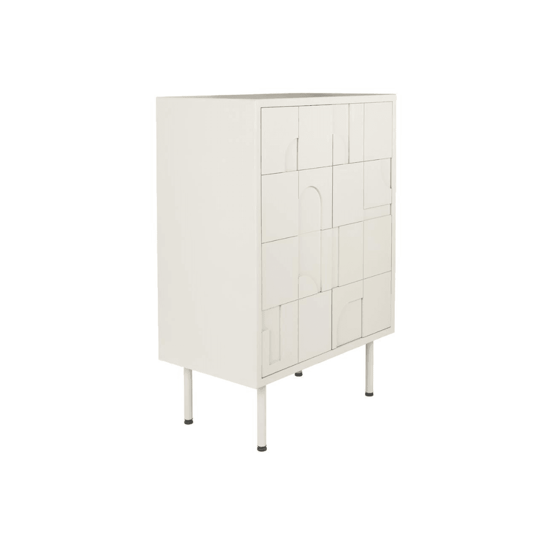 The Funk cabinet is a stylish beige piece of furniture that adds character to any room with its clean shape and unique pattern. Its design provides practical storage space, which is the perfect choice for those who love trendy furniture. The cabinet is made of high-quality materials and is guaranteed to have a long service life.