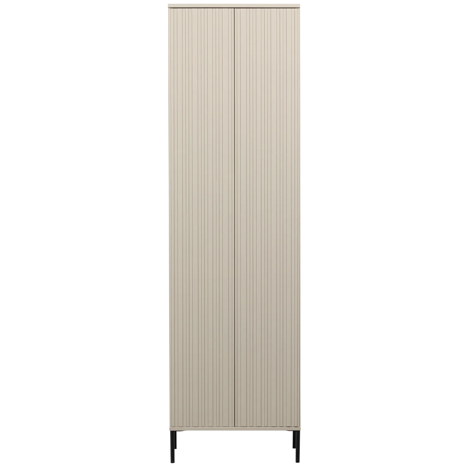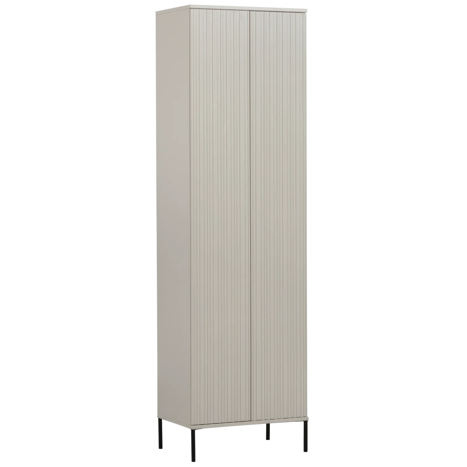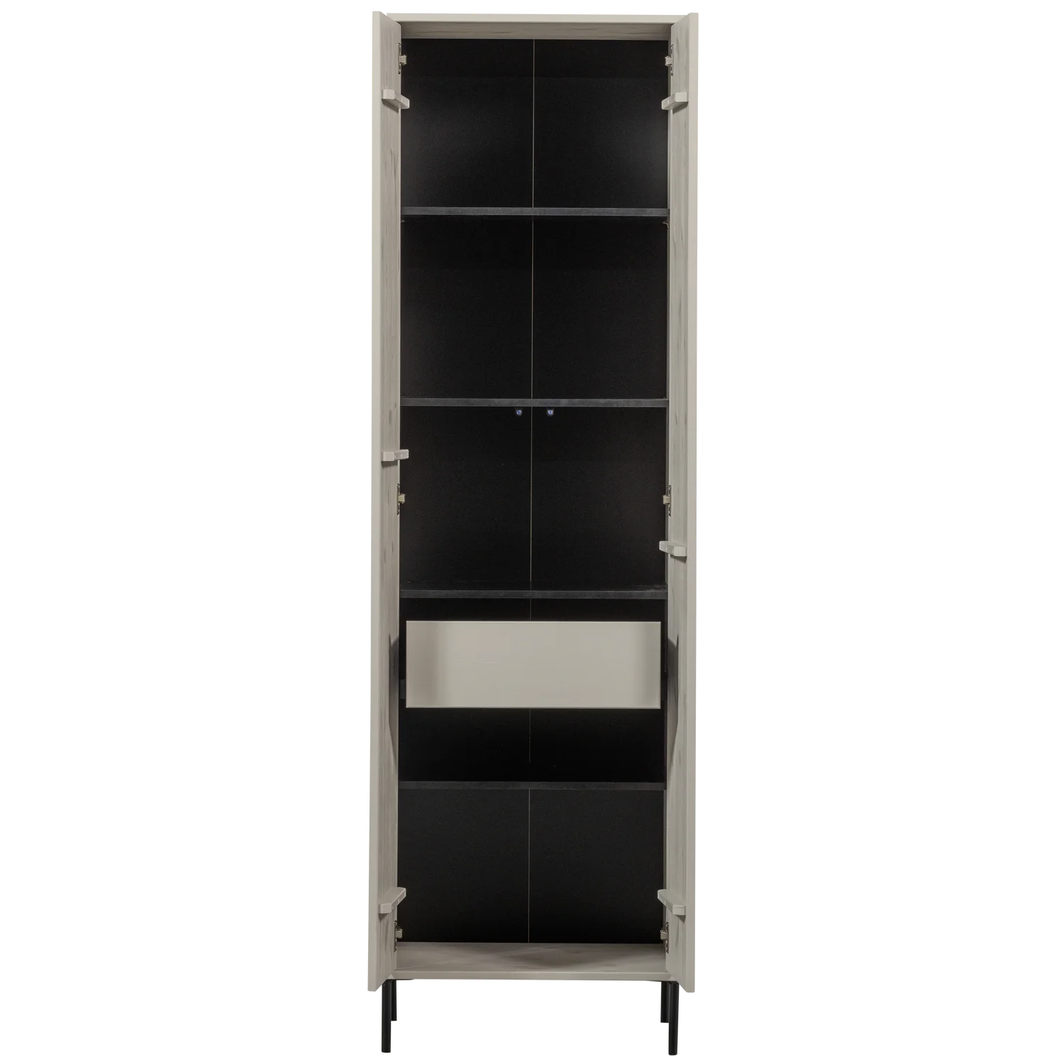 Our successful New Gravure series introduces this 60x42x210 cm cabinet, a narrow and tall cabinet from the collection of Dutch interior design brand WOOOD. This cabinet is made of pine and coated with matt lacquer. The interior is made of black chipboard and the legs are made of metal. The New Gravure cabinet has two doors with a silent push-to-open system, four shelves and one drawer. It is available in black or light gray.