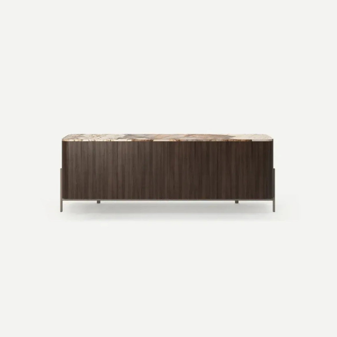 The Shell cabinet stands out with the minimalist elegance of the wooden structure and the almost invisible metal base that creates a feeling of suspension, an exclusive "shell" with simple but strict lines for storing objects. Another characteristic element of this piece of furniture is the marble, wood or ceramic top, which can be freely chosen. Available sizes: 177x48x77 / 230x48x77 cm.