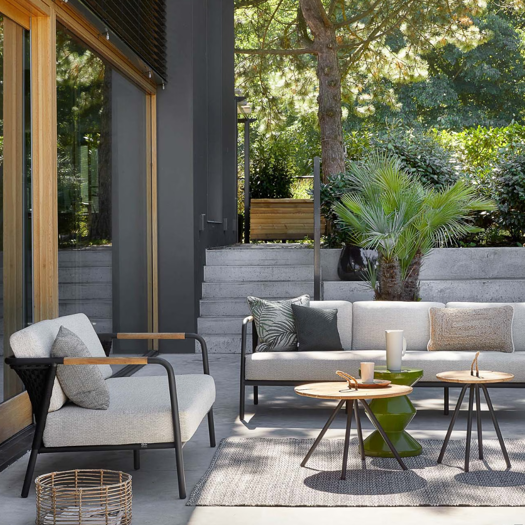 We have also released the Elle collection in a Lounge version. We have combined three different materials to give this set a beautiful, elegant look. For example, the armrests of the armchair are made of teak wood inlay, which matches the black color of the set very nicely. The frame of the seating is made of matte black aluminum.