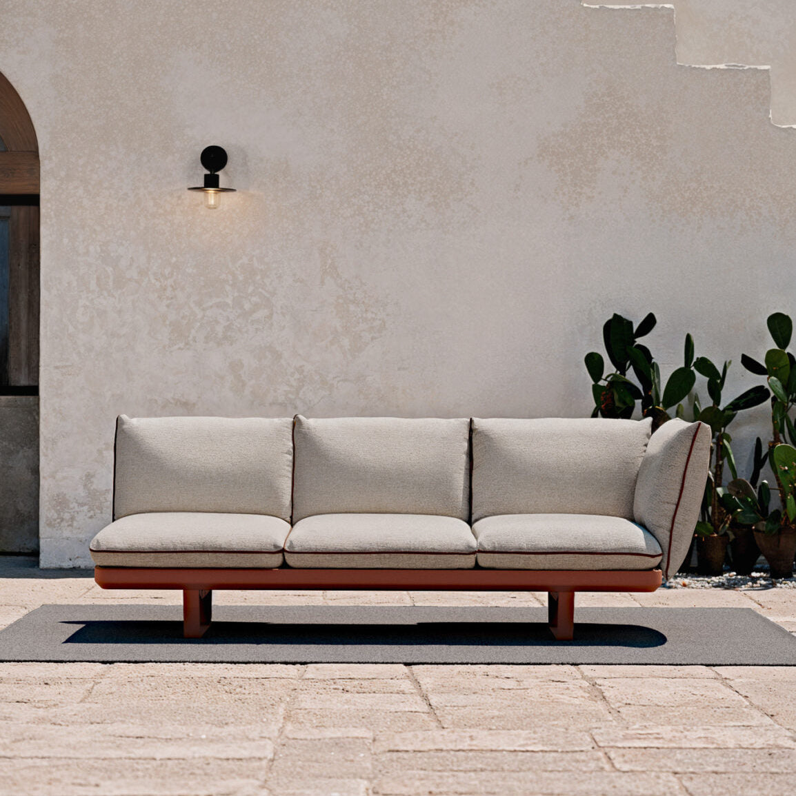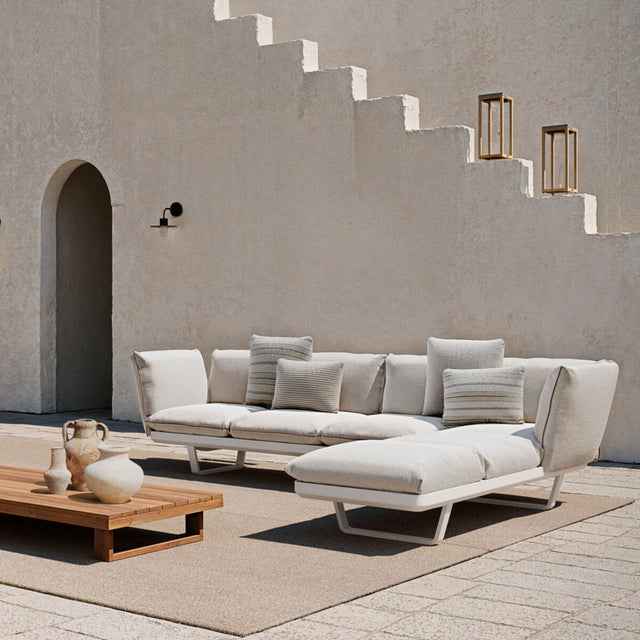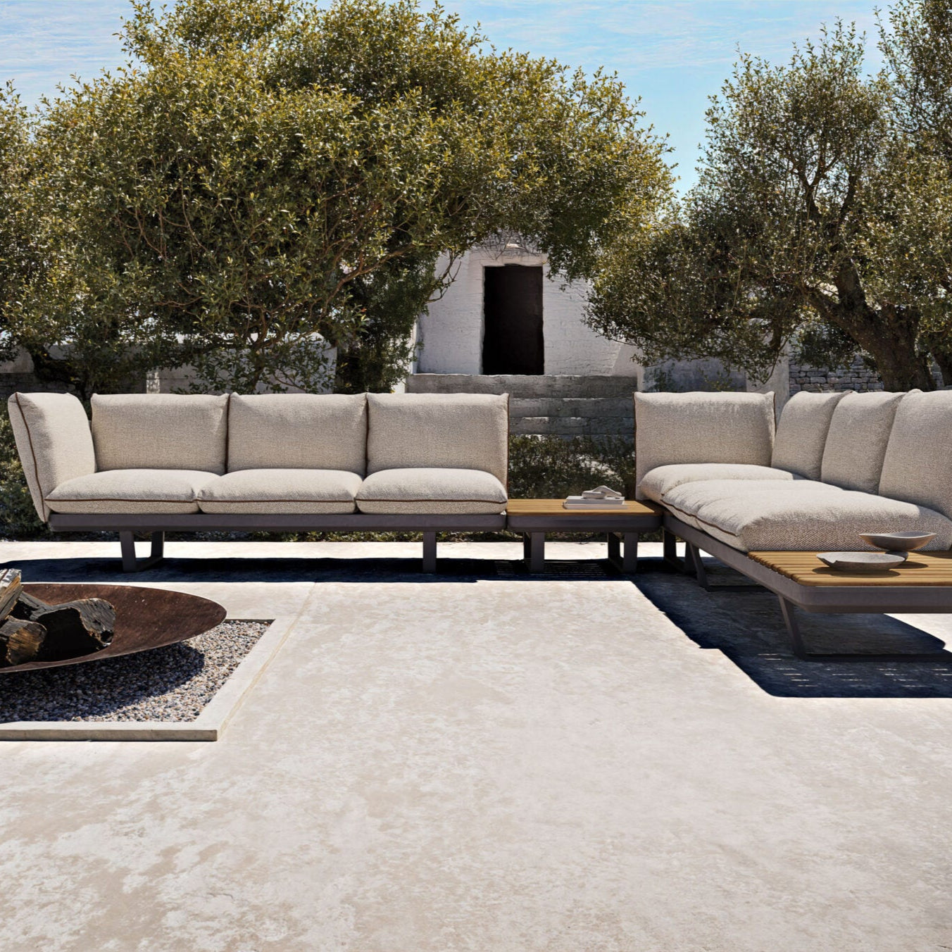 Elegant shapes, essential aesthetics and neutral tones: this is Venice, a balanced blend of sophistication and comfort. The soft upholstery rests on a light and airy structure. In addition to its aluminum frame, it is possible to add teak details and fully customize the composition down to the last detail.