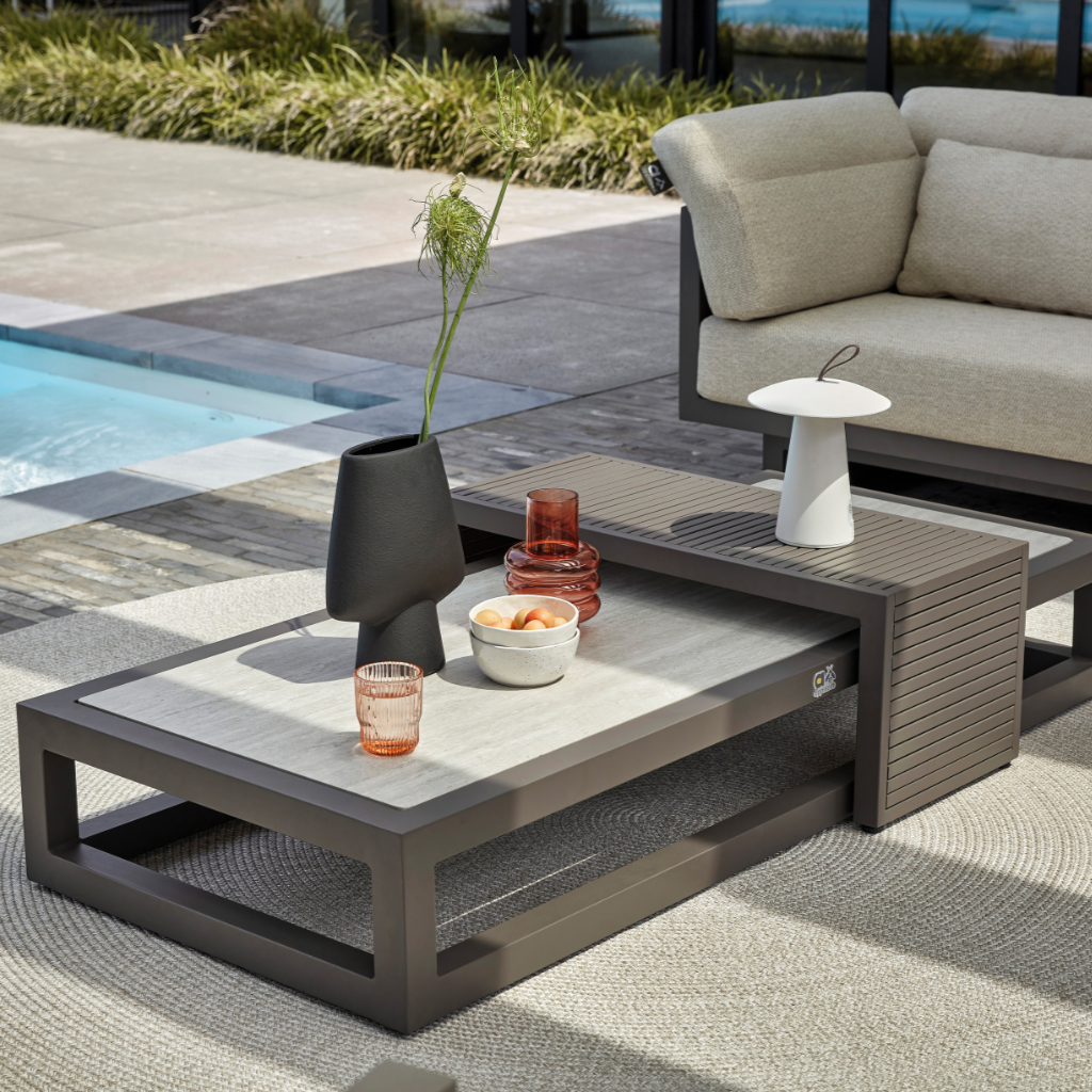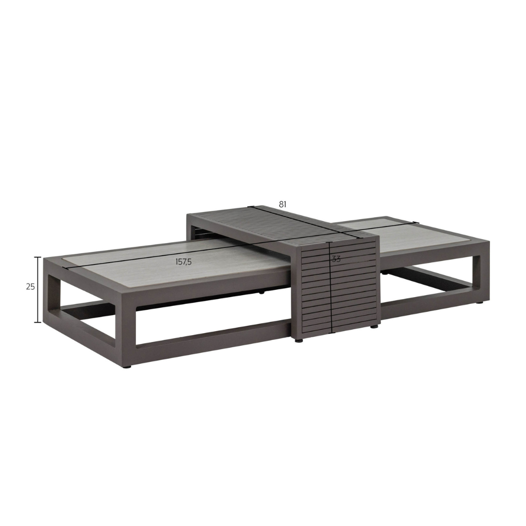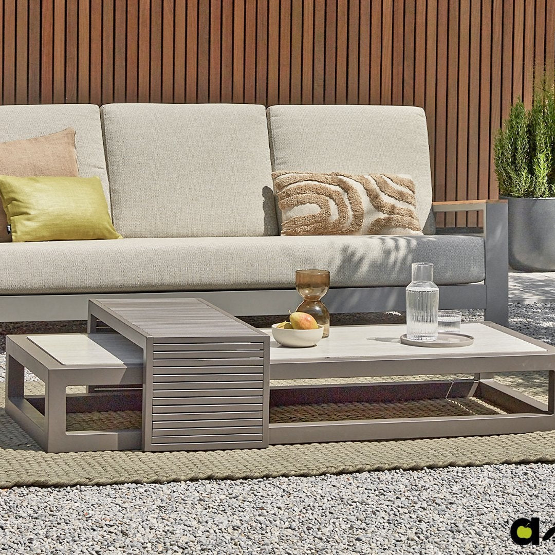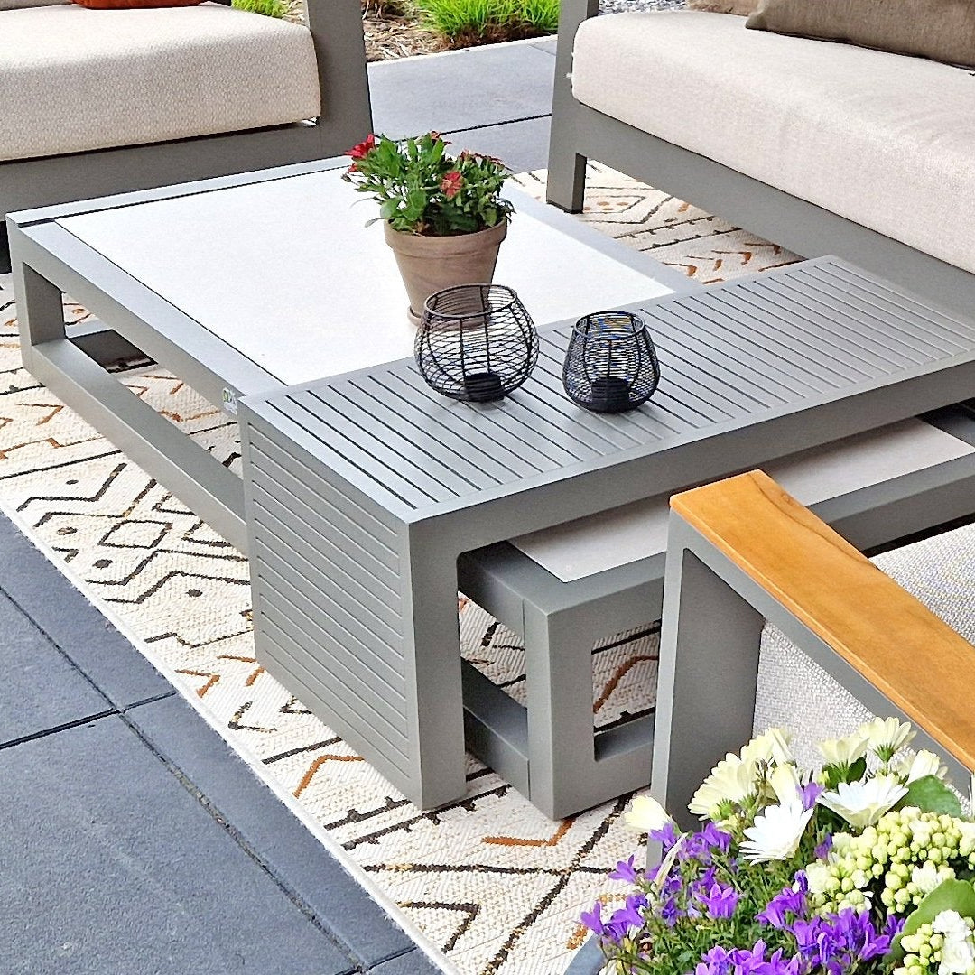 Ha szereted a karcsú és kubista formákat, de nem akarsz semmit sem feláldozni az egyéniségből akkor a Santorini kollekció tökéletes választás. Elegáns alumínium váz, négyszögletes csőváz, meleg taupe színű porszórt bevonattal. A teljesen alumíniumból készült lerakóasztal gyönyörű lécekkel rendelkezik, és tökéletesen rácsúszik a dohányzóasztalra. Ez az asztal azonban két kanapé közé is elhelyezhető, így az ital mindig elérhető közelségben marad, és a készlet játékosabb elrendezést kap. Állítsd össze a Santorinit teljesen olyanra, amilyenre szeretnéd.