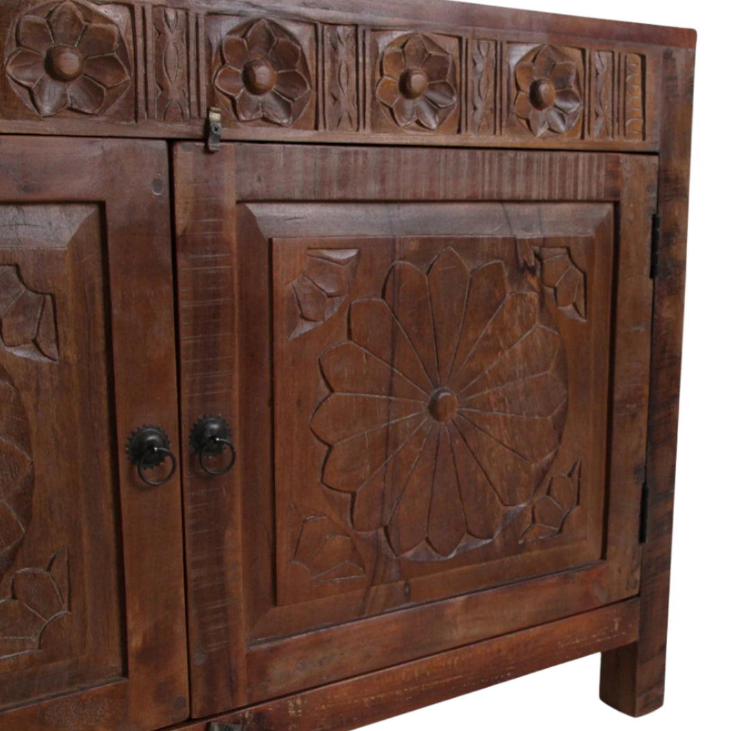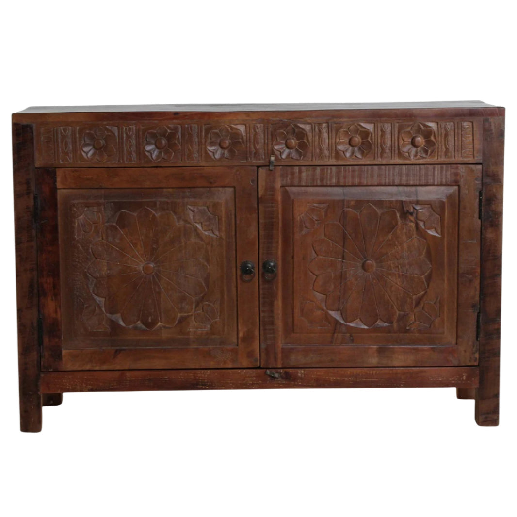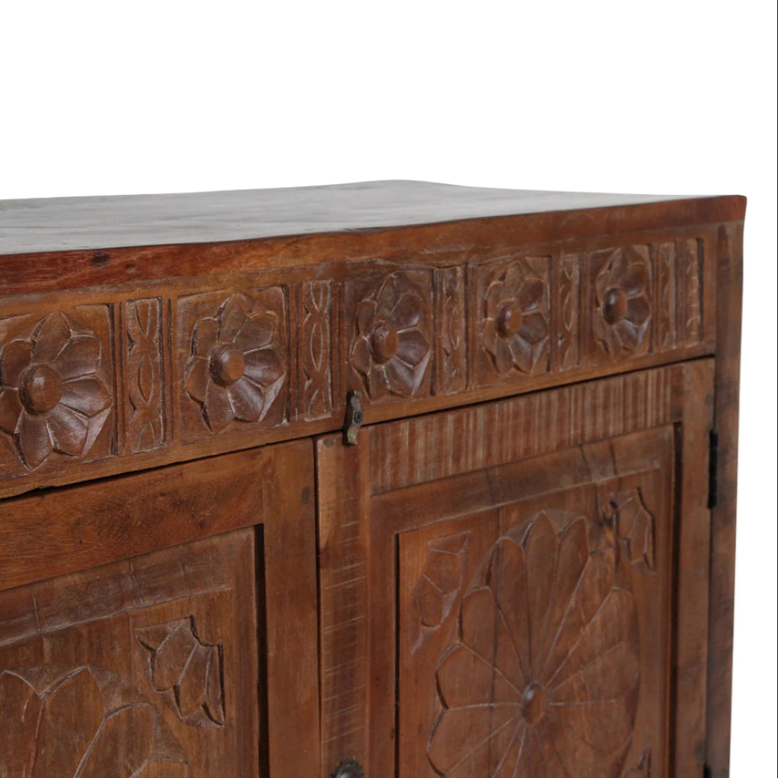 Komód a Factory kollekciónkból. A komód 2 ajtaján napraforgó faragványok találhatók. Tökéletes ágyneműk, könyvek vagy egyéb tárgyak tárolására. A Factory kollekció 100%-ban újrahasznosított fából készült. A fa régi házakból származik, amelyeket lebontott, elhagyott gyárakból, padlódeszkákból, fali panelekből és tetőszerkezetekből származik. A fa sötétebb árnyalattal rendelkezik az évek óta tartó használat miatt.