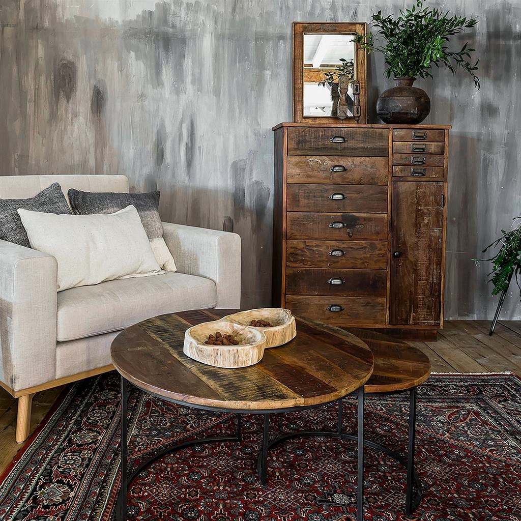 Kabinet a Factory kollekcióból. Tárold kedvenc vagy leghasznosabb dolgaidat ezzel a sok fiókos és ajtós kabinettel, ami kiválóan alkalmas kisebb holmik rendszerezésére. Ideális a nappaliba, hálószobába vagy konyhába. Többféle változatban is kapható. A Factory fa kollekció 100%-ban újrahasznosított fából készült. A fa régi házakból származik, amelyeket lebontott, elhagyott gyárakból, padlódeszkáikból, fali paneljeikből és tetőszerkezeteikből származik. A fa a hosszú évek használatától sötétebb árnyalattal rendelkezik.
