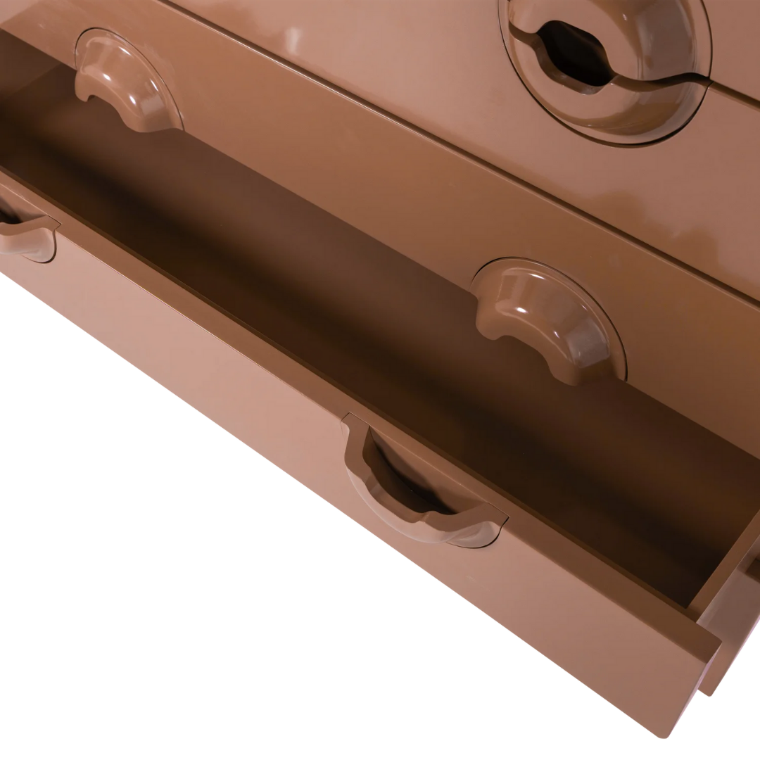 Merge is a chest of drawers with a retro design from the Woood collection. This versatile piece of furniture has four spacious drawers, each with a uniquely designed handle for easy opening. It offers plenty of space for organizing various items, and its beige color will fit well into any interior.