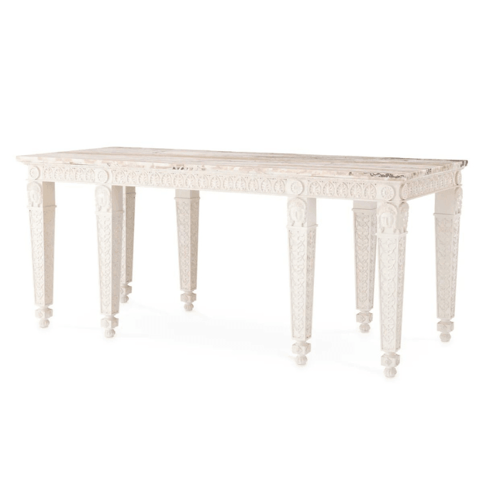 As part of the Met x Eichholtz collection, we present the Croome Court Marble Console Table, inspired by the delicate ornamentation of British console tables. With an antique white finish and a fabulous marble top, the design is reminiscent of the 18th-century work of British architect Robert Adam and Danish artist Sefferin Alken. It brings a special elegance to any space, where historical charm meets modern sophistication. This table is suitable for both modern and classic interiors.