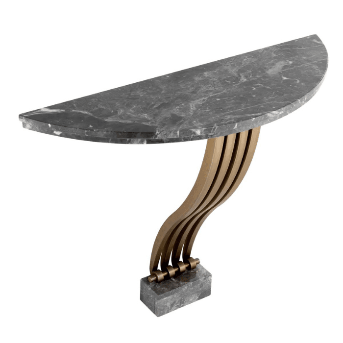The stylish Renaissance marble console table is the perfect addition to any traditional interior. The semi-circular table top is made of grey marble and rests on four elegantly curved polished brass legs that exude a stylish confidence. The curved legs placed on a block of marble base make this classic console table a truly stunning piece that will look perfect in a hallway or living room. An excellent choice for lovers of classic elegance.