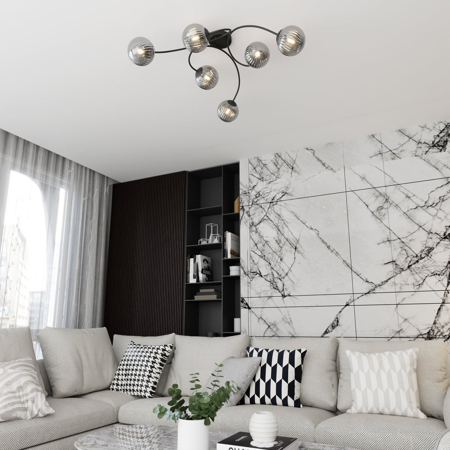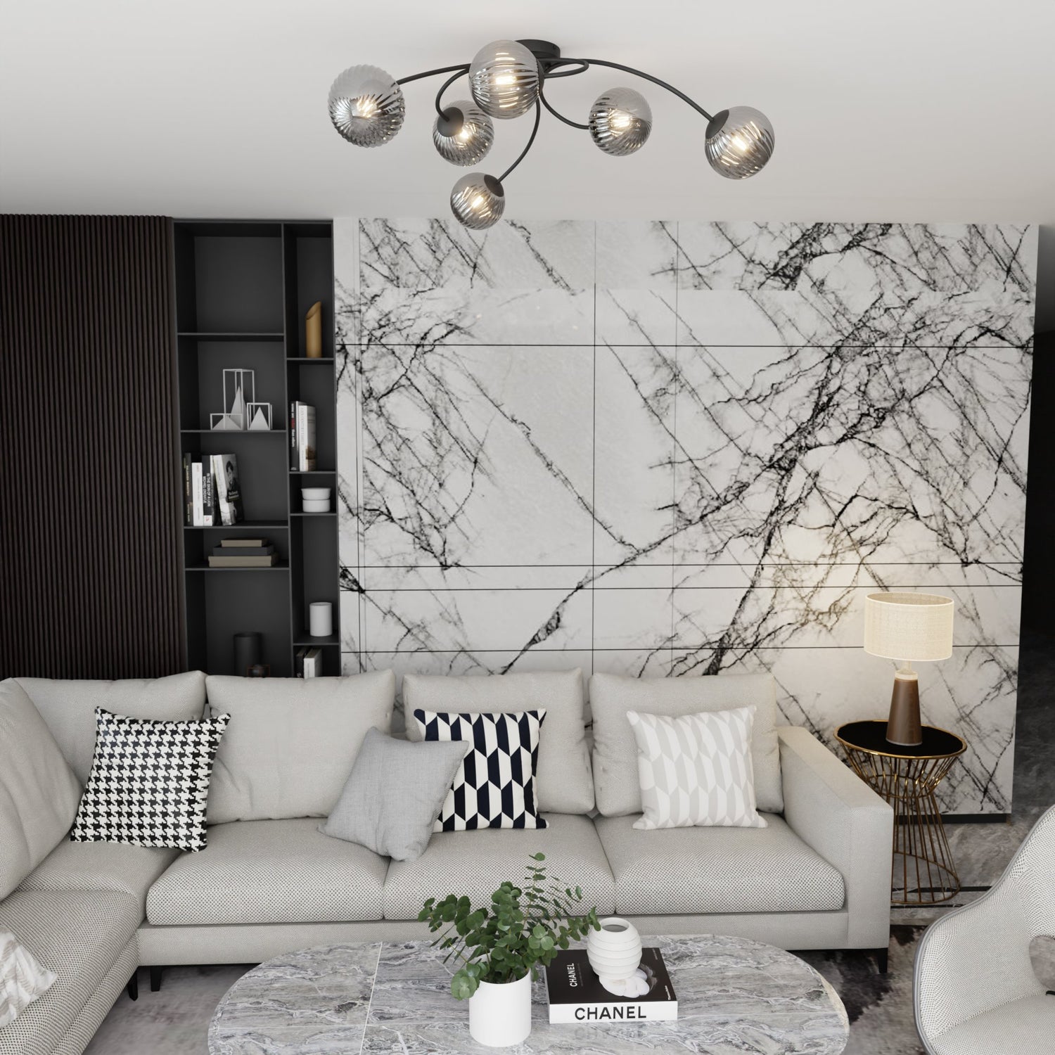 The Vibra series is a universal and timeless collection of ceiling lamps. Its minimalist style fits into the latest trends while maintaining timeless elegance. The most fashionable glass lampshades decorated with original textures look extremely stylish and provide excellent lighting in the room. The unique design of the Vibra series delights, the metal construction is simple but still great. Available in 4 or 6 light sources. Bulbs are not included.