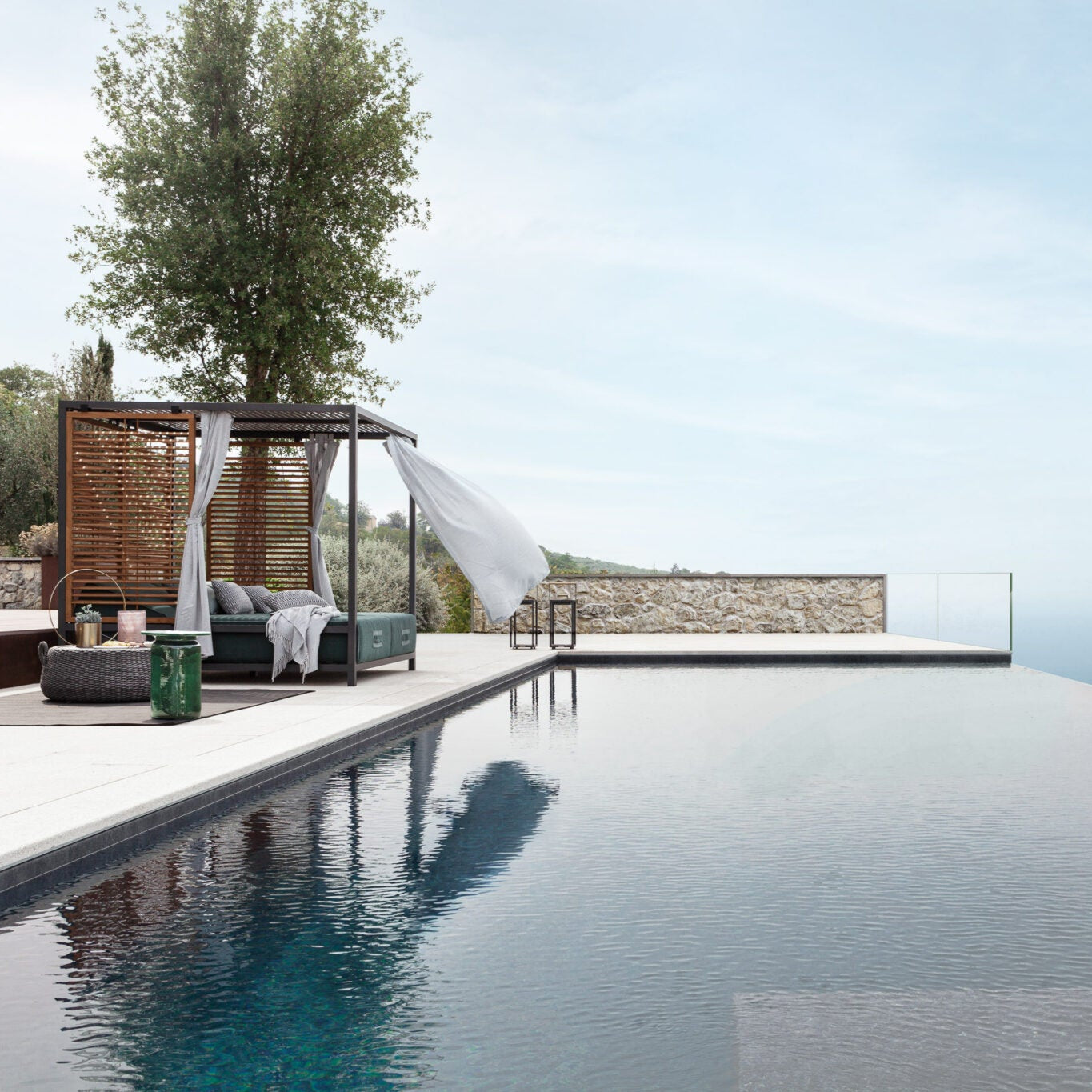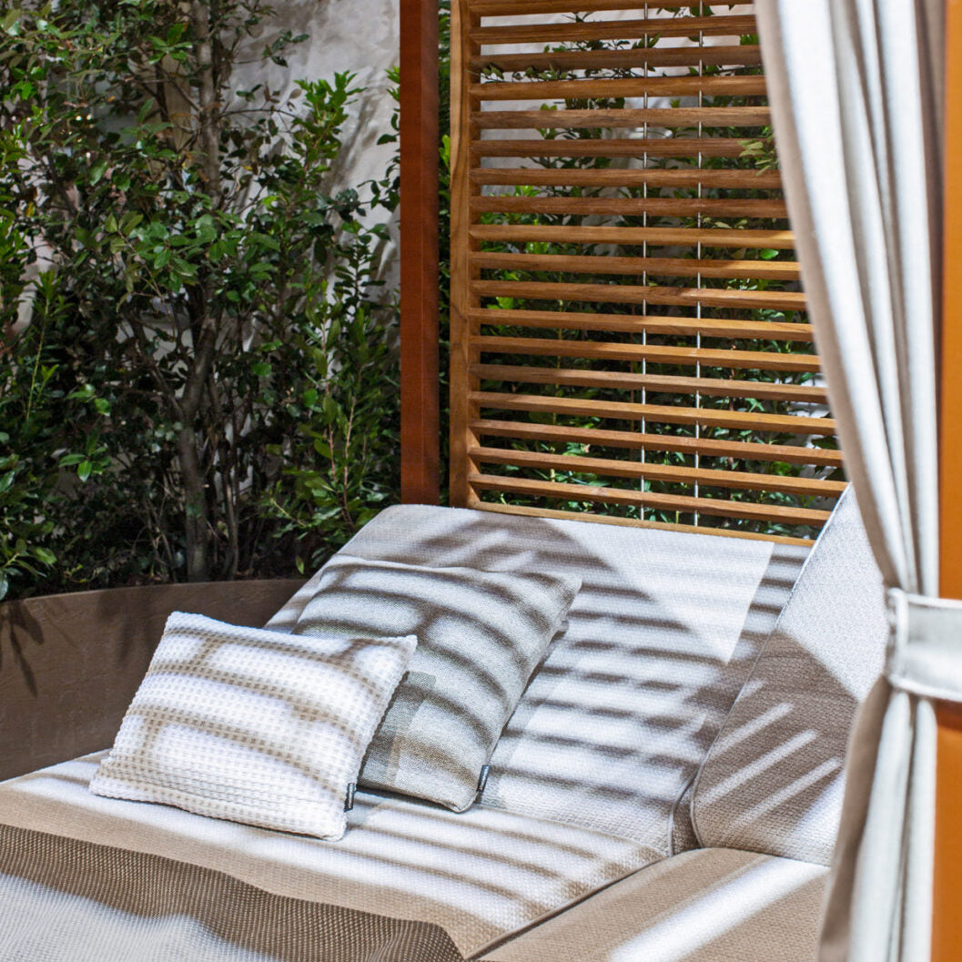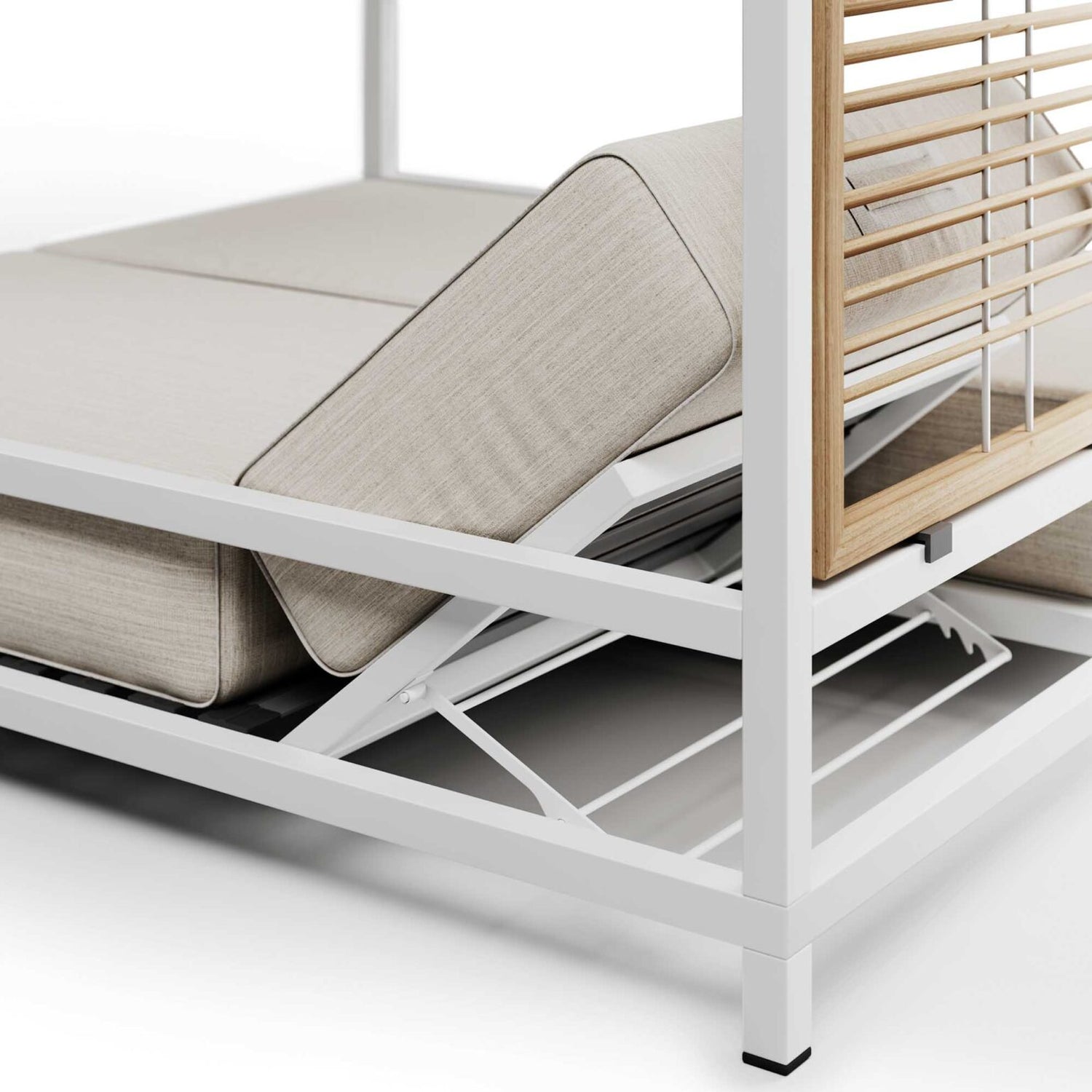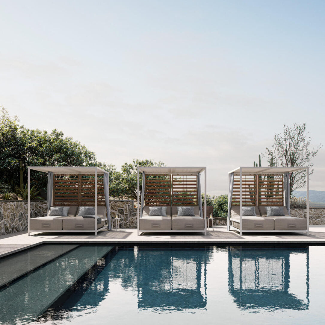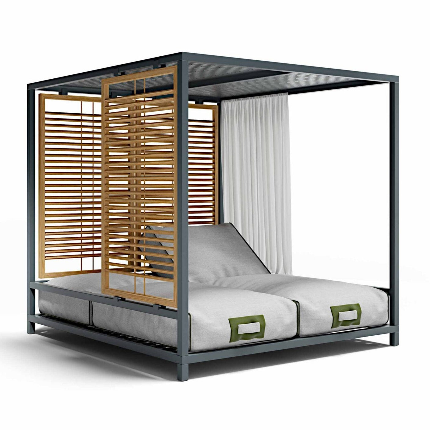 Az Alcovát hibrid, fedett, de a külső környezettel és a természettel kommunikáló, intim térként tervezték meg. Egy masszív, de kényelmes alumíniumszerkezet, egy moduláris teakfa panelekből álló rendszer, amely védelmet nyújt anélkül, hogy bezárna, egy kényelmes és ergonomikus puhaság, ahol egy olyan egyedi dimenzióra lelhetünk, amiben a tér és az idő a saját tempónkban dobog.
