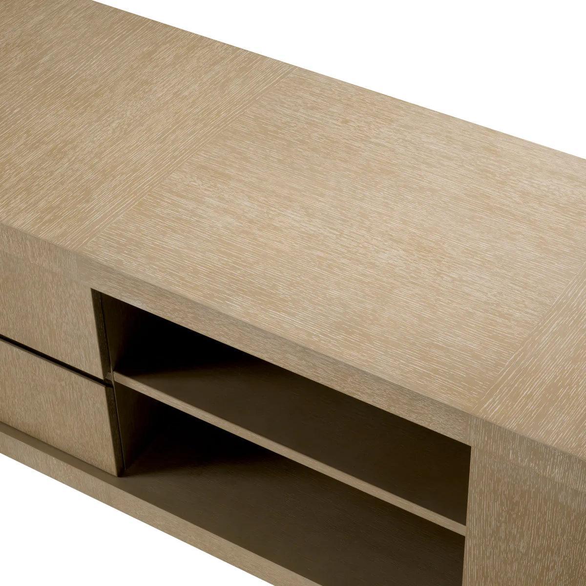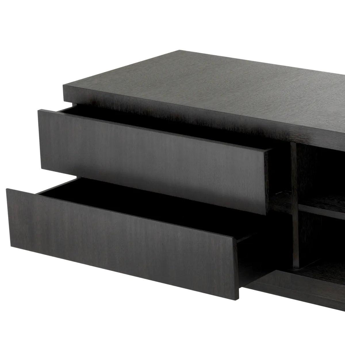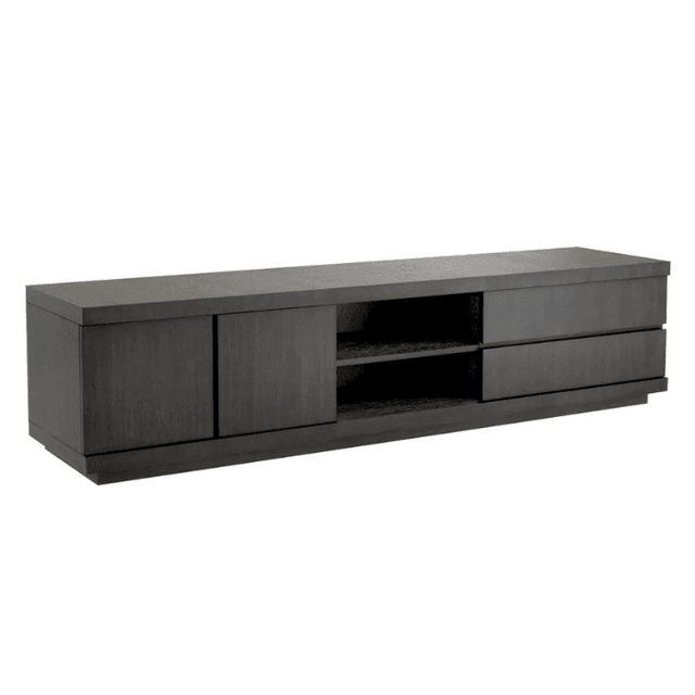 The Crosby wooden TV stand combines aesthetic modern urban style with high functionality. It is a great choice if you are looking for a more expressive piece of furniture for your home. With its simple but robust design, it is a perfect choice for contemporary interiors. In addition to the two-door shelf, it also has two drawers and two freely accessible shelves. Both the doors and drawers operate with a soft-close mechanism.