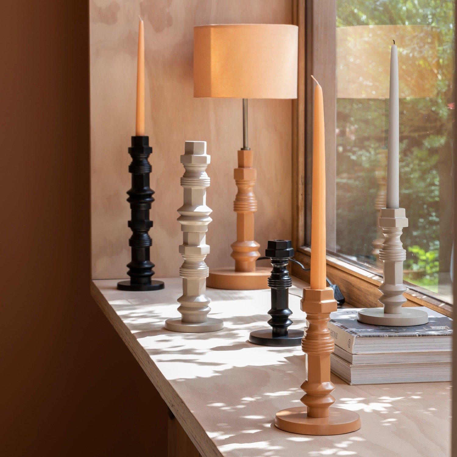 The Totem candle holder is an elegant accessory that will brighten up any interior with its detailed workmanship and modern look. Available in beige, black and terracotta, you can easily find a version that matches the style of your home or office. Thanks to its durable material, it has a long lifespan.