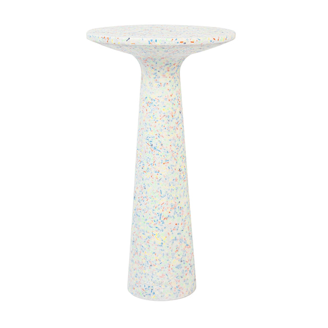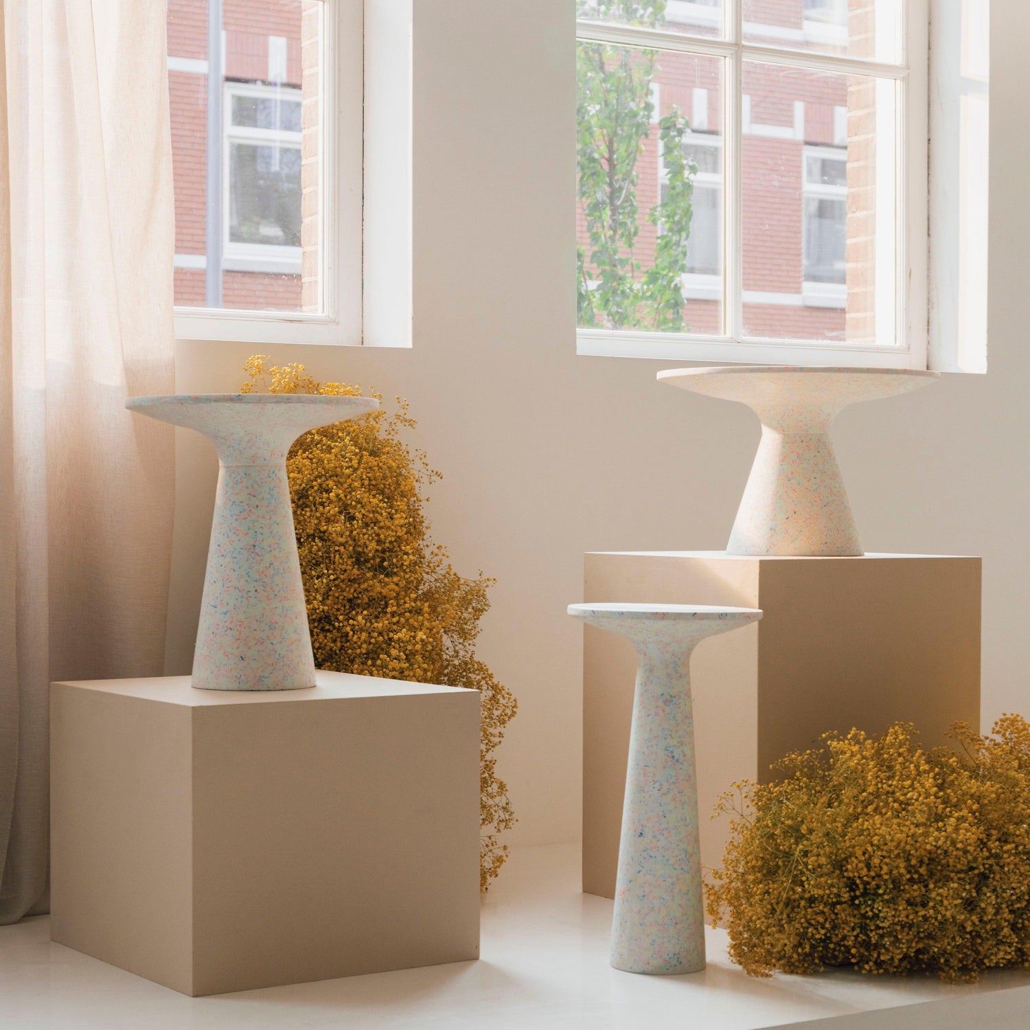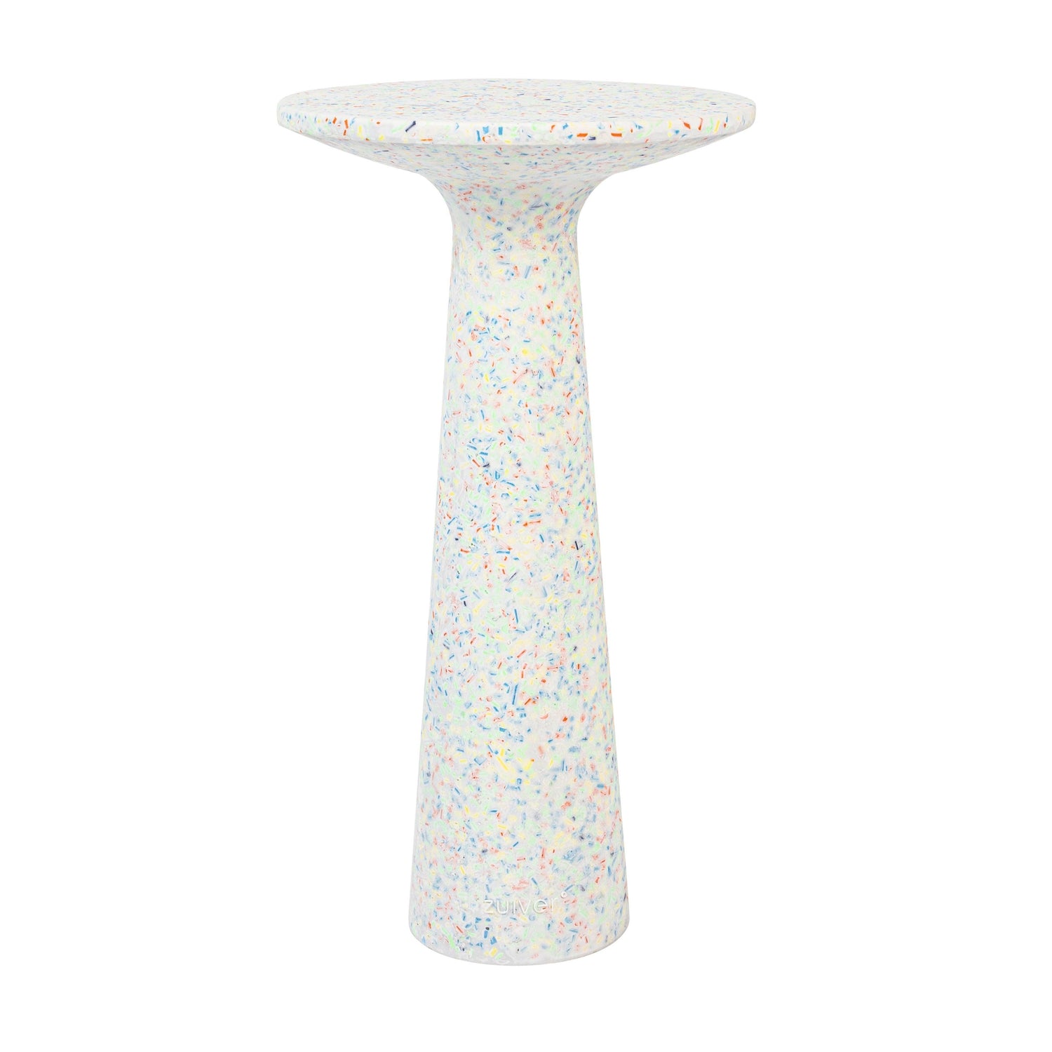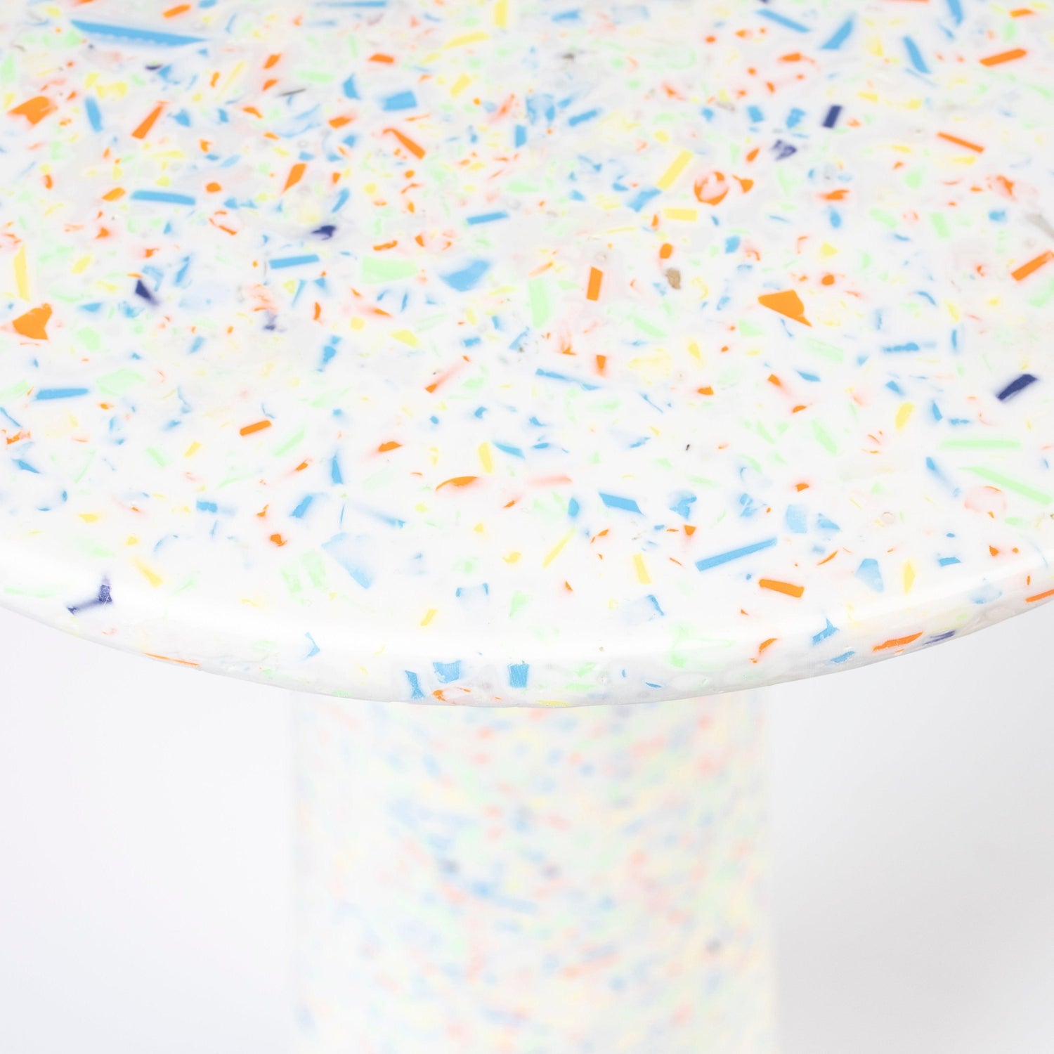 The table top, made using terrazzo and recycled toys, reflects a modern and environmentally friendly approach, which is also attractive and durable. It can be used flexibly for both indoor and outdoor use, making it an ideal choice for terraces, gardens and living rooms.